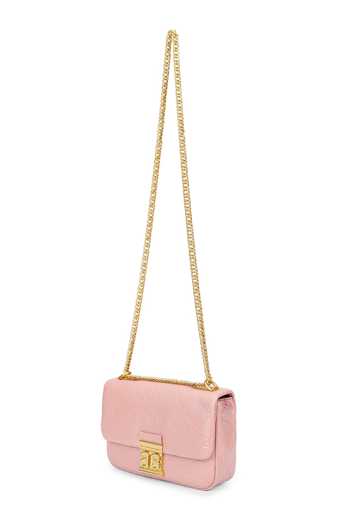 This flap bag boasts an embossed signature monogram, adorned with gold-toned hardware and a chic chain strap. This bag exudes luxury and refinement, perfect for any occasion.