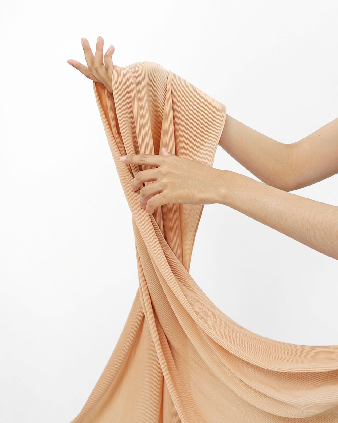 Tips lainnya saat menjemur, pastikan kamu menjemur pashmina plisket dengan menggulungnya terlebih dahulu di hanger, tidak di tali atau kawat jemuran langsung supaya lipatannya tetap terjaga rapi.