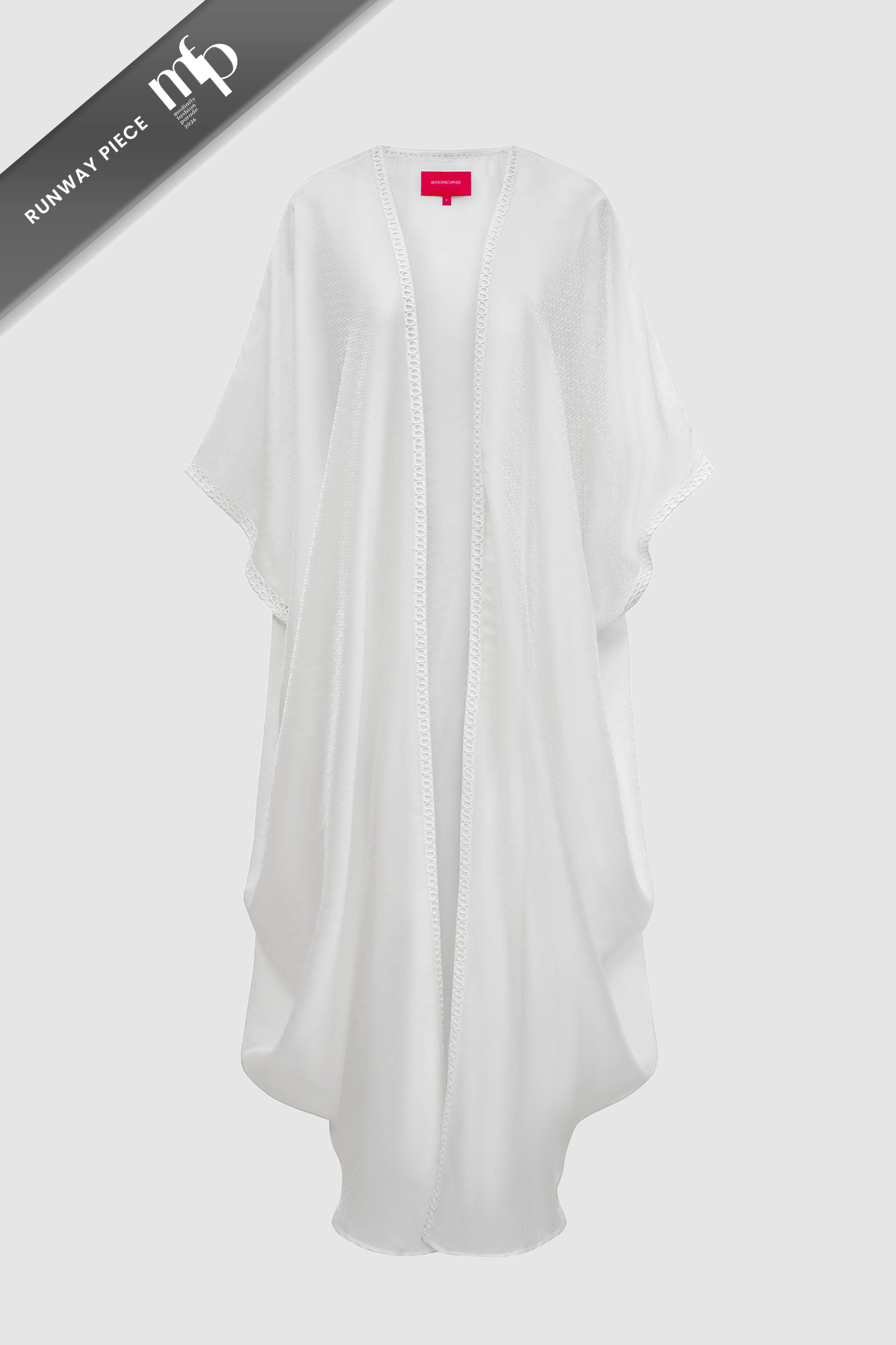 Designed as a timeless layering piece, this long outer features a lightweight fabric that falls gracefully for an elegant look. The relaxed silhouette allows easy movement and versatile styling across different occasions. Subtle texture and delicate lace trim along the edges add a feminine finish, making it a polished addition to both casual and formal outfits.