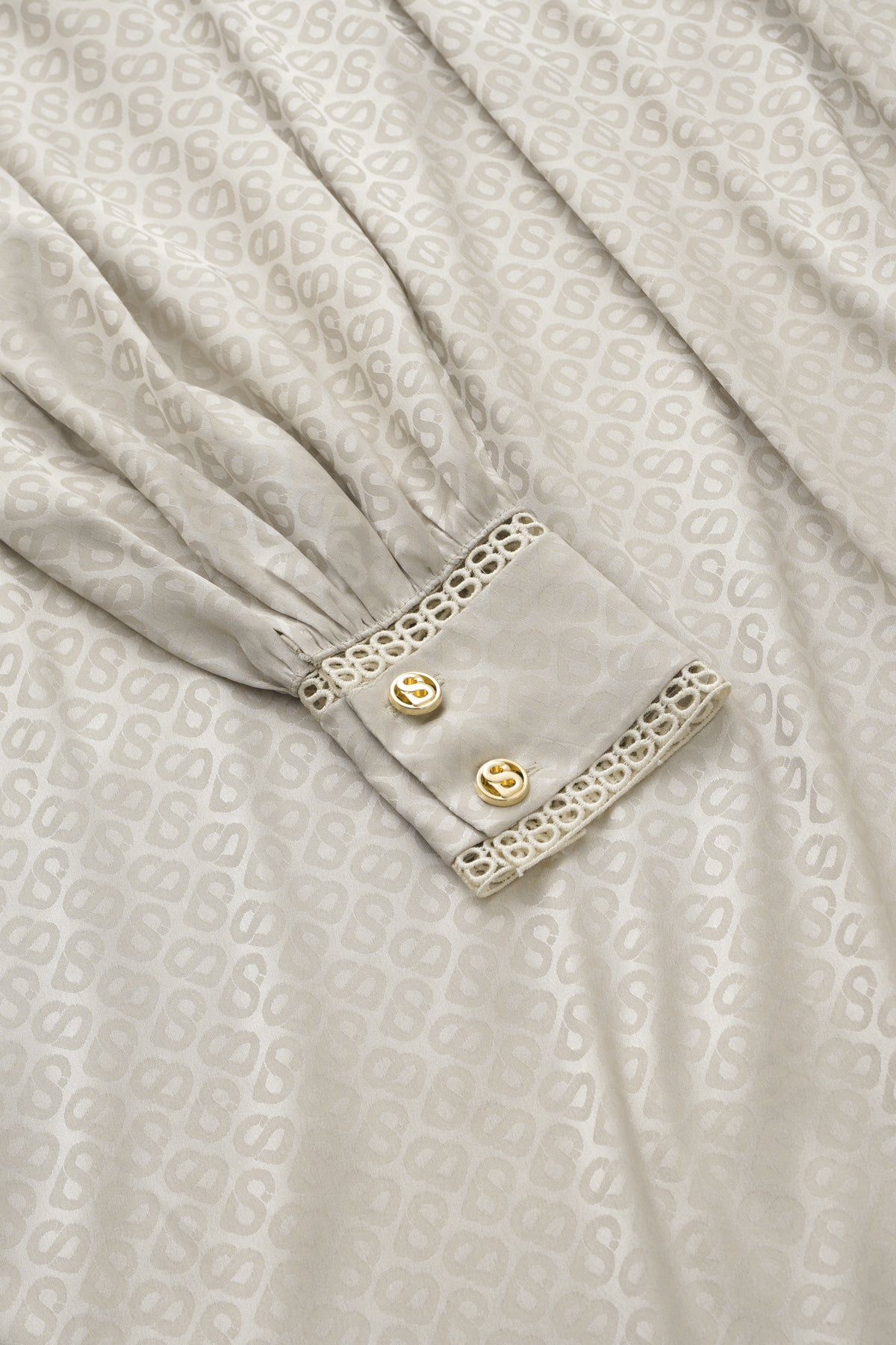 This dress is defined by its graceful silhouette and elegant jacquard texture with a subtle sheen. Designed with a high neckline and soft pleats with tie-waist detail that shapes a flattering fit. Delicate lace trim at the cuffs adds a romantic finish, making it a timeless piece that blends modesty with modern sophistication.