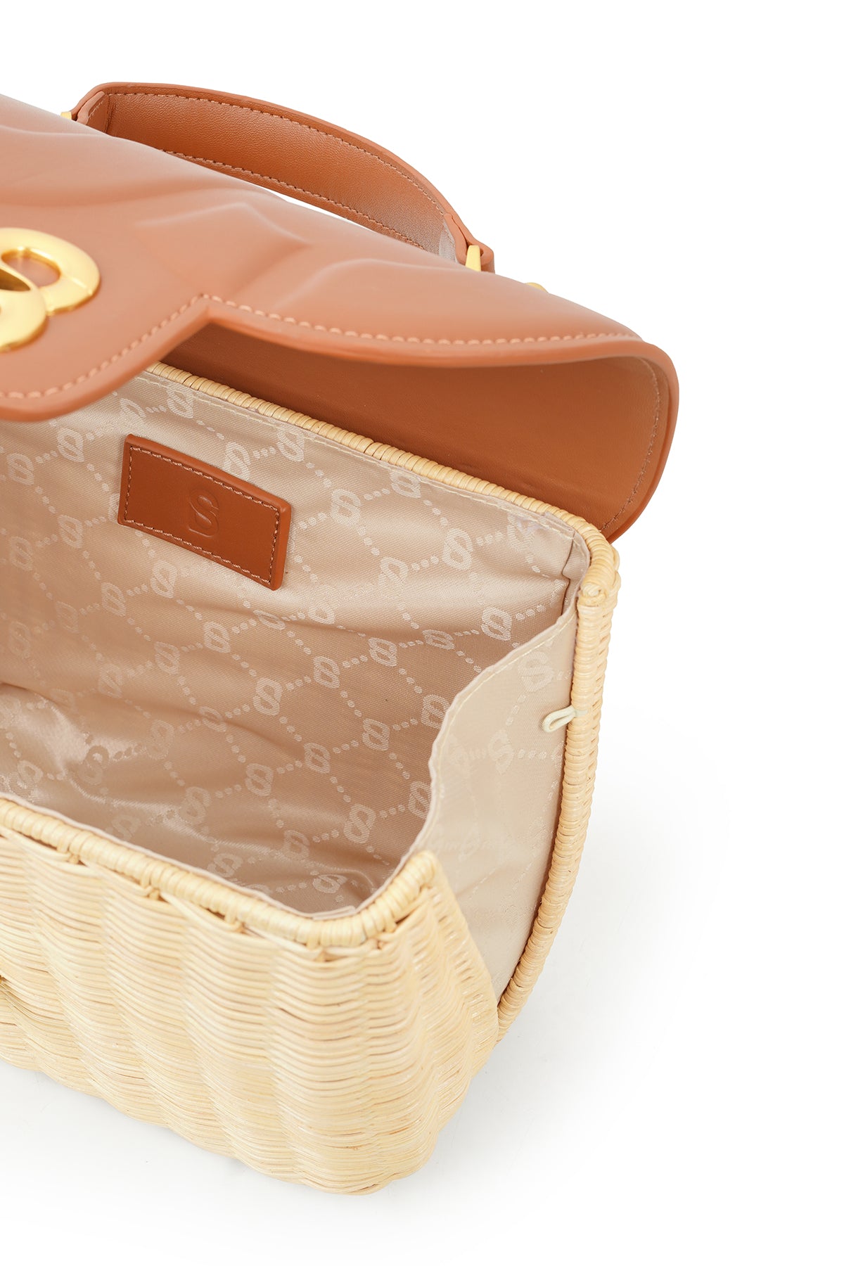 Crafted from high-quality rattan and cow leather, this bag is perfect for carrying everyday essentials. Its embossed flap top features a distinctive gold signature B lock, complete with a gold chain strap.