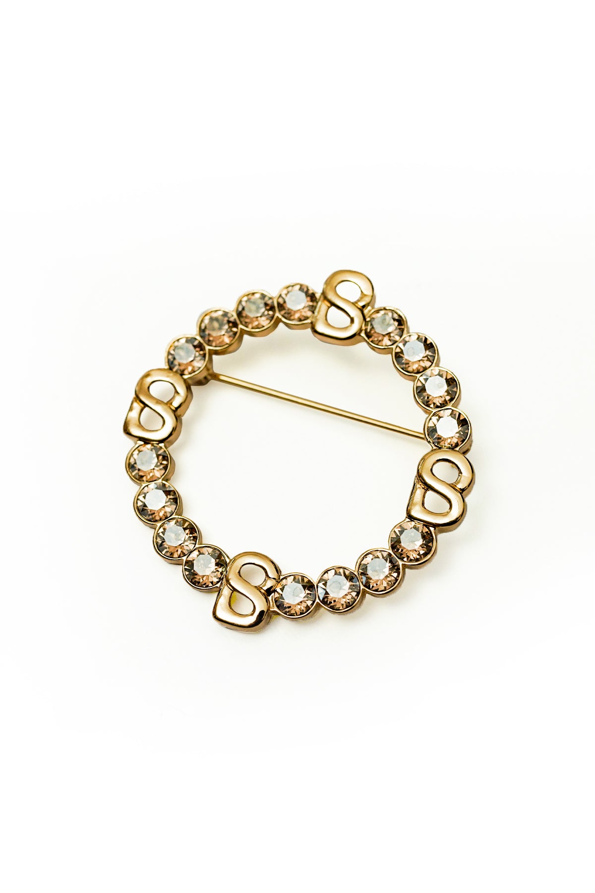 This vintage round brooch set with faux pearls and the iconic B design. Beautifully crafted with stunning and opulence Swarovski crystal and gold plated material.
