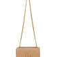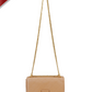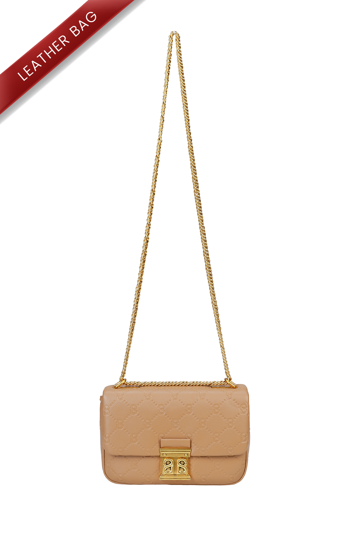 This flap bag boasts an embossed signature monogram, adorned with gold-toned hardware and a chic chain strap. This bag exudes luxury and refinement, perfect for any occasion.