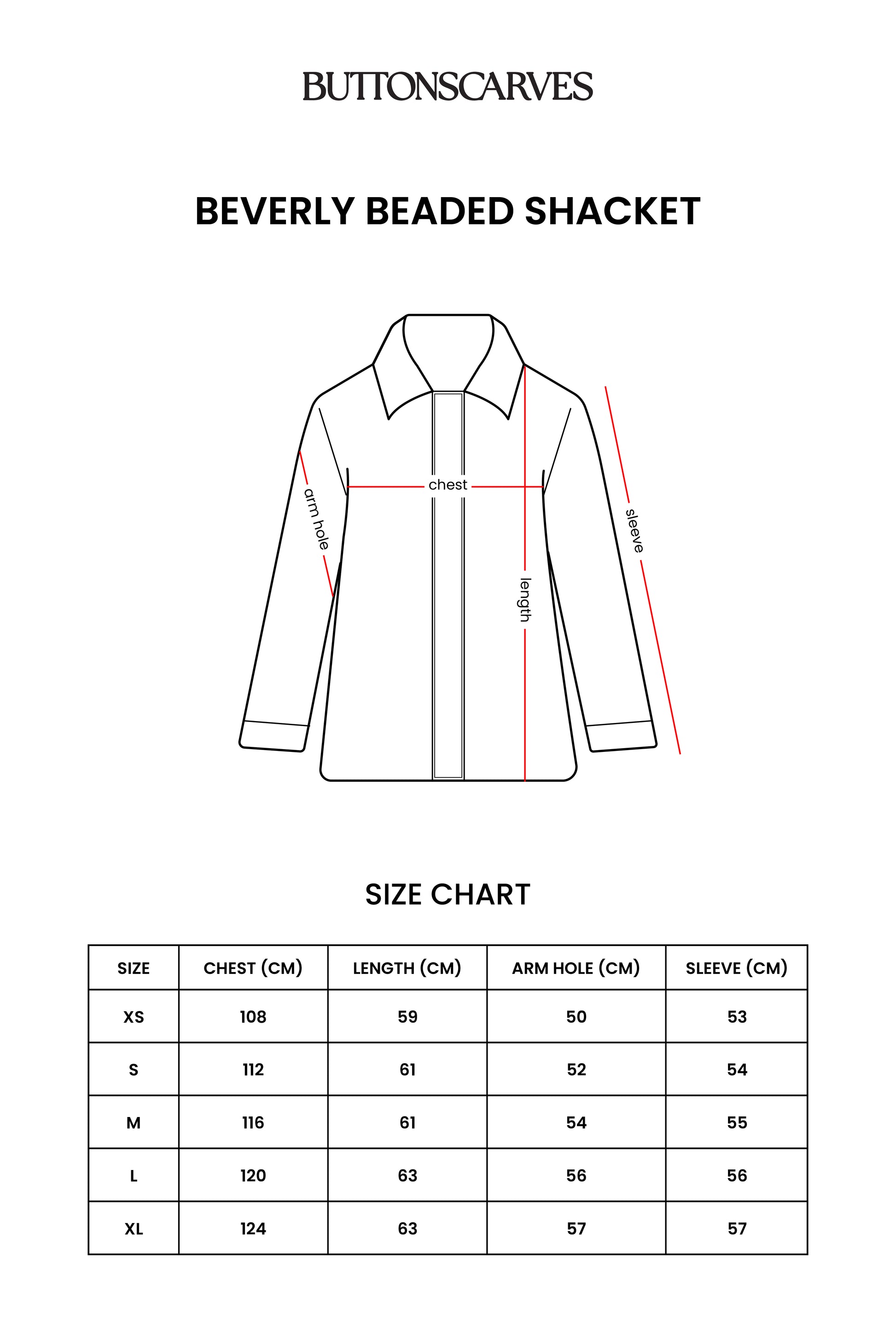 A standout runway piece from Dubai Fashion Week S/S 26, designed in a structured shacket silhouette with a pointed collar and concealed front closure. Embellished with the Beverly monogram traced with hand-applied beading and sequins across the entire front, back, and sleeves.