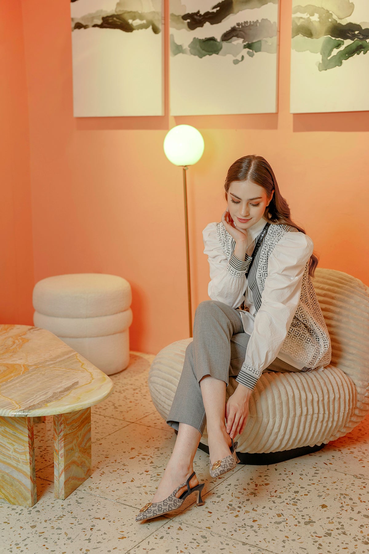 Step into easy elegance with the chic Bimu Kitten Heels. Crafted in Bimu monogram fabric and sheepskin leather, It has an elasticated slingback. Its pointed-toe style sits on easy-to-wear 6cm kitten heels and is detailed with gleaming signature B hardware.