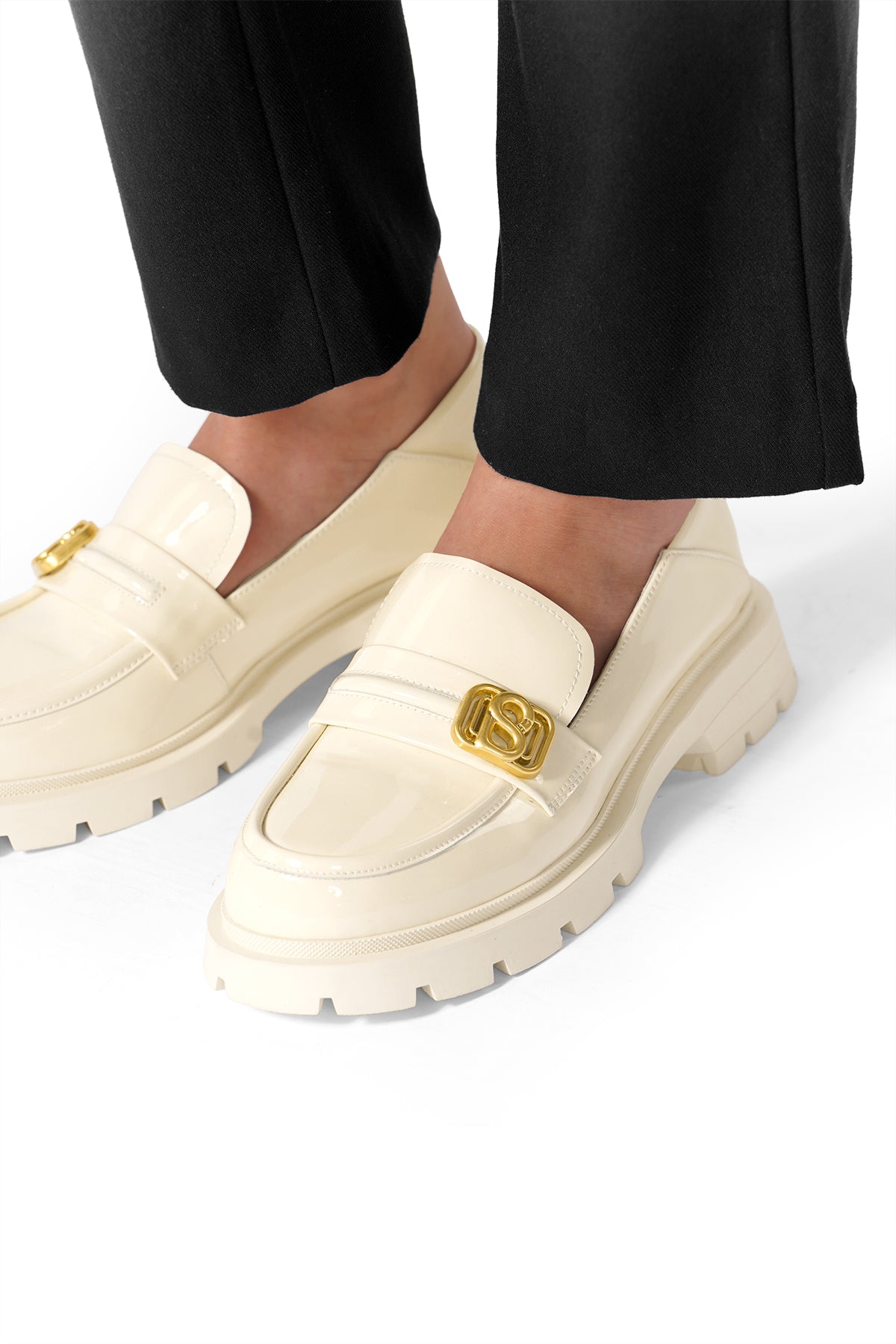 A bold statement crafted from 100% patent leather for a sleek finish. Featuring a chunky silhouette and adorned with the iconic gold Briana logo, this loafer offers both edge and sophistication.