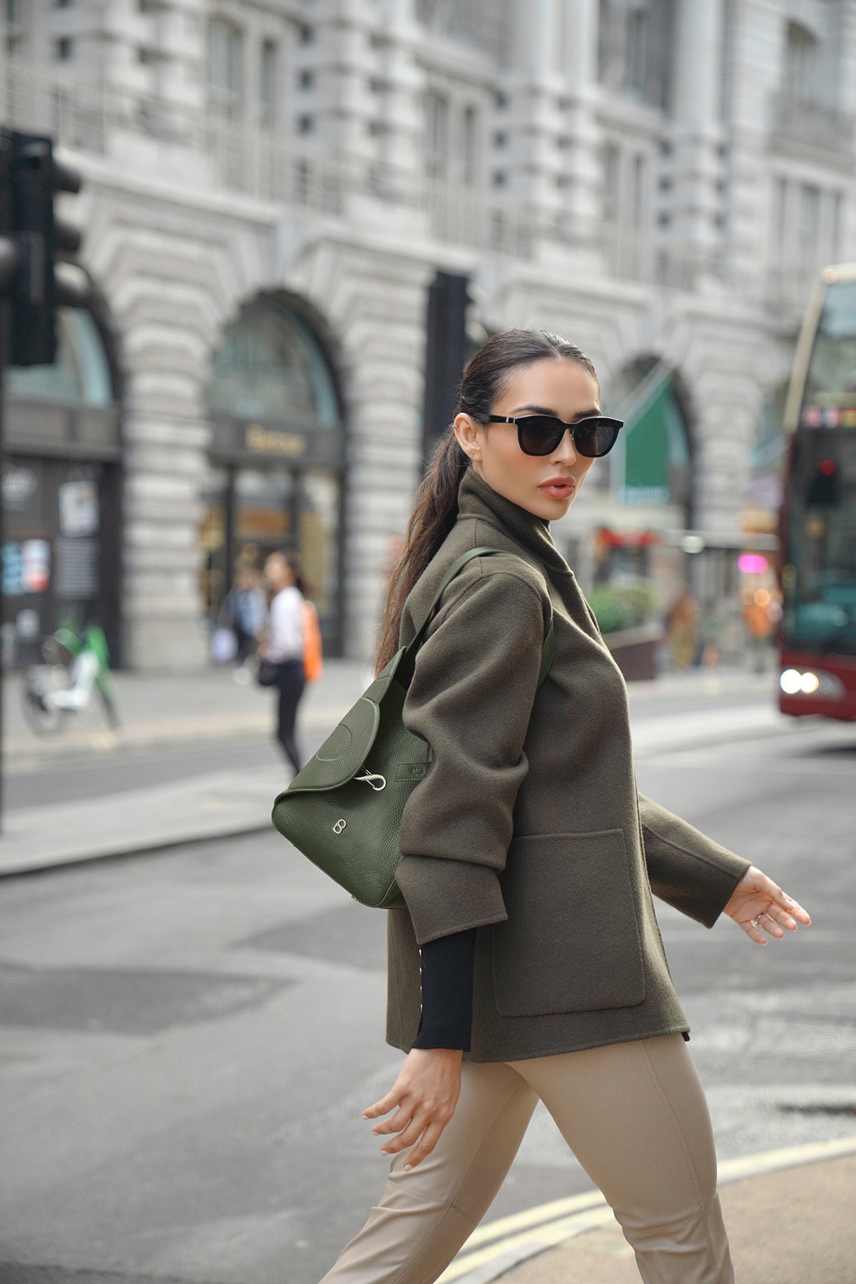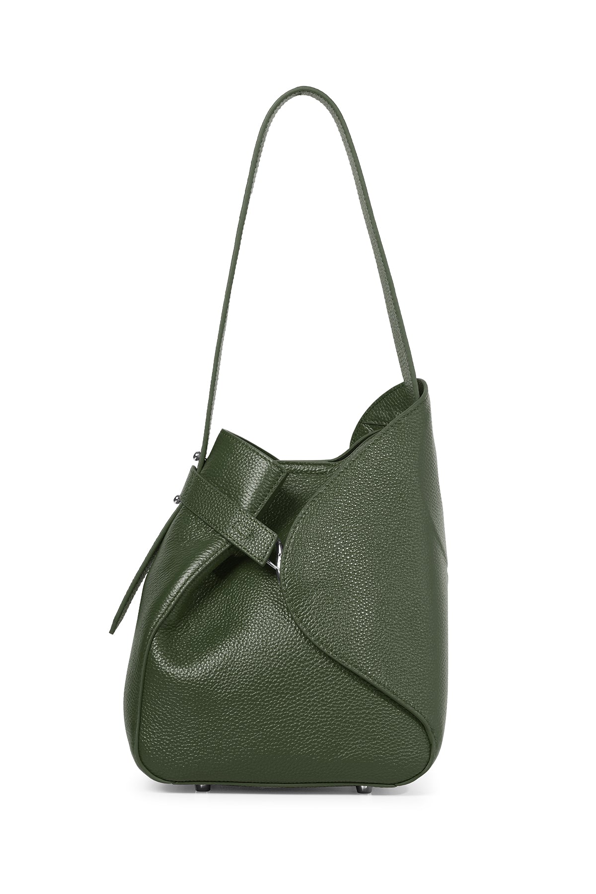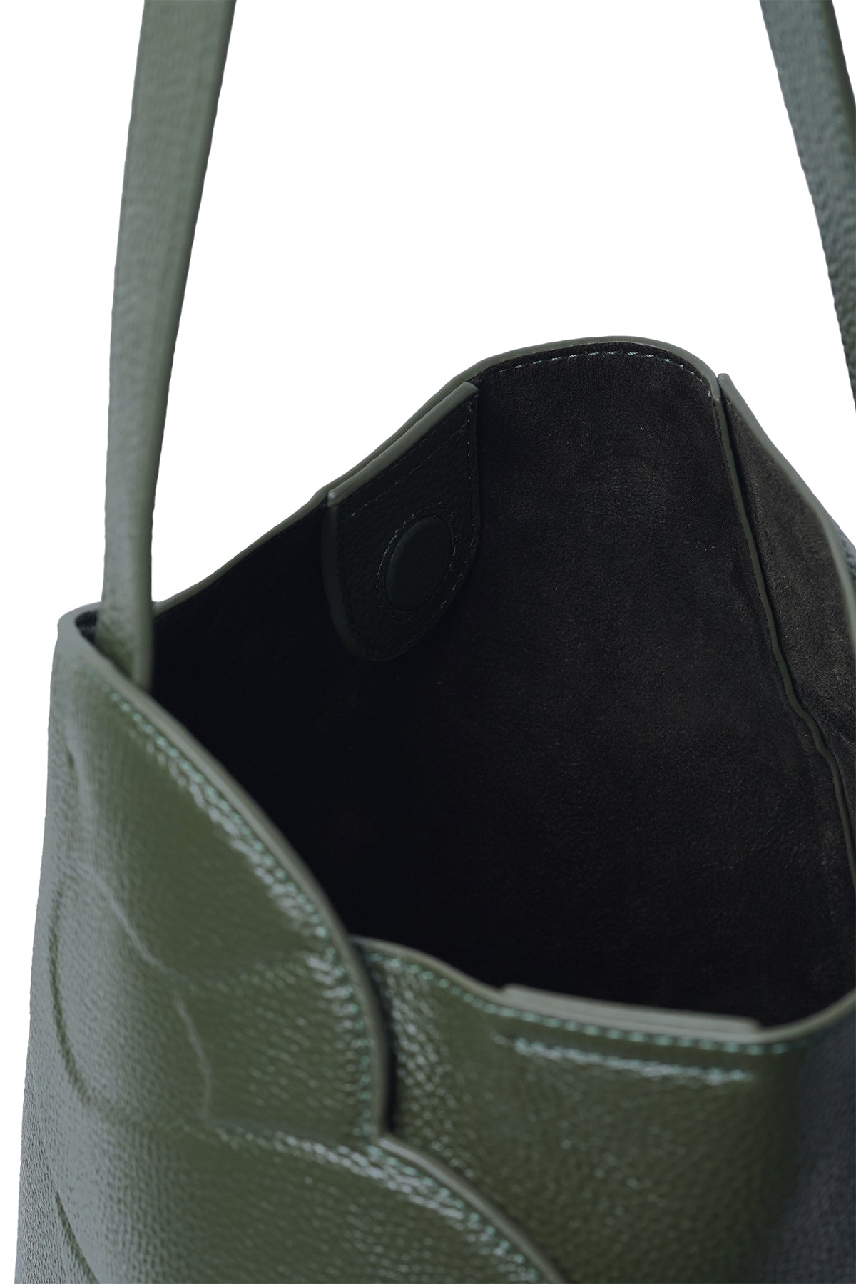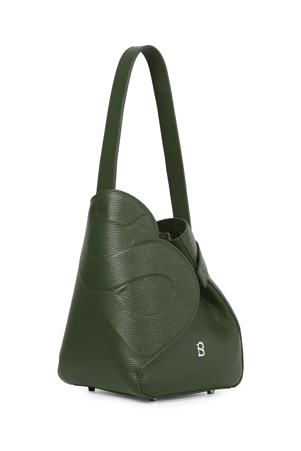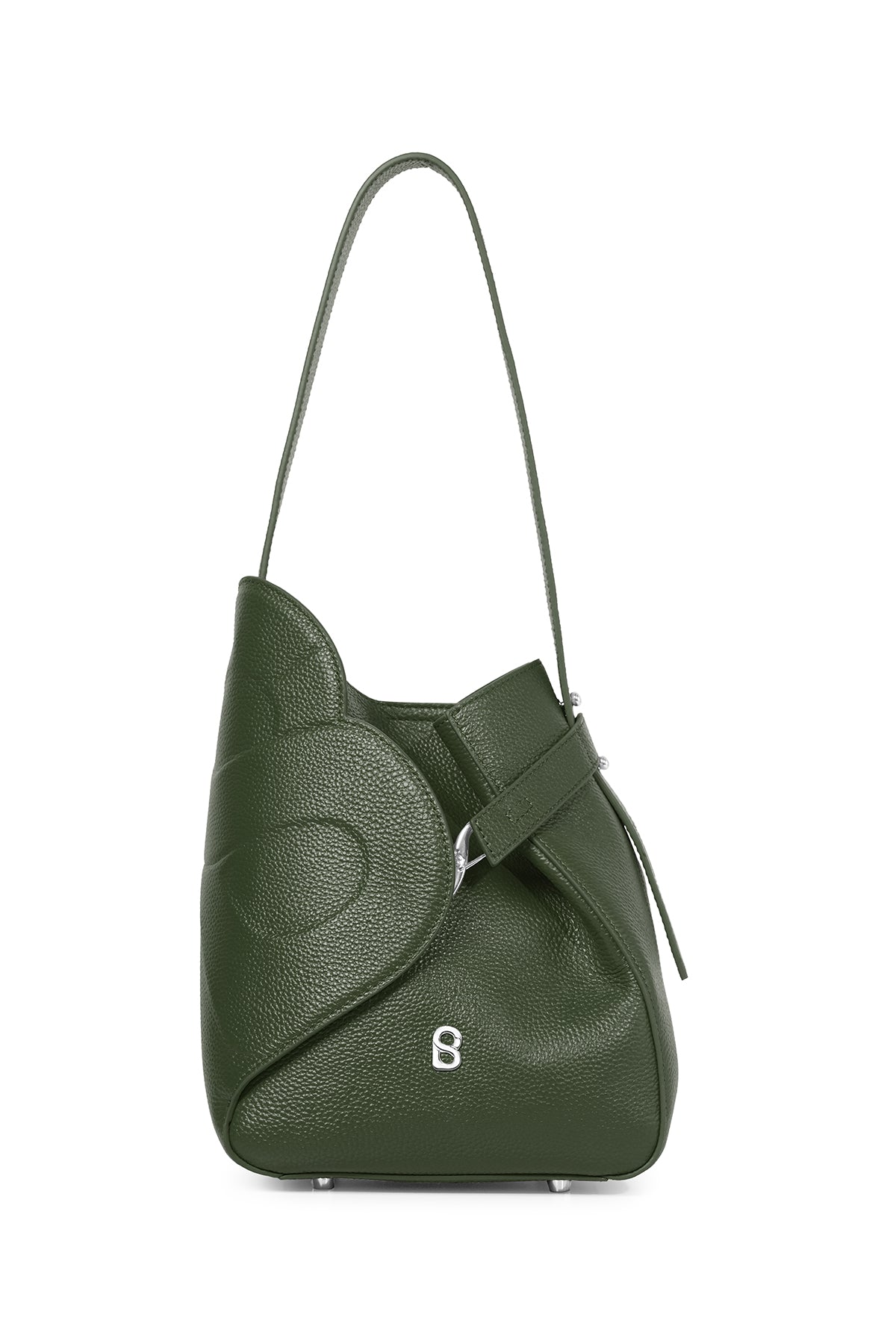 Meticulously crafted from high-quality pebble cow leather. Designed in a folded style bucket bag silhouette, embellished with the embossed signature B logo, this piece exudes sophistication and elegance.