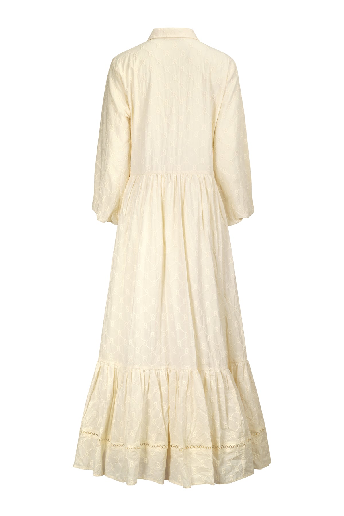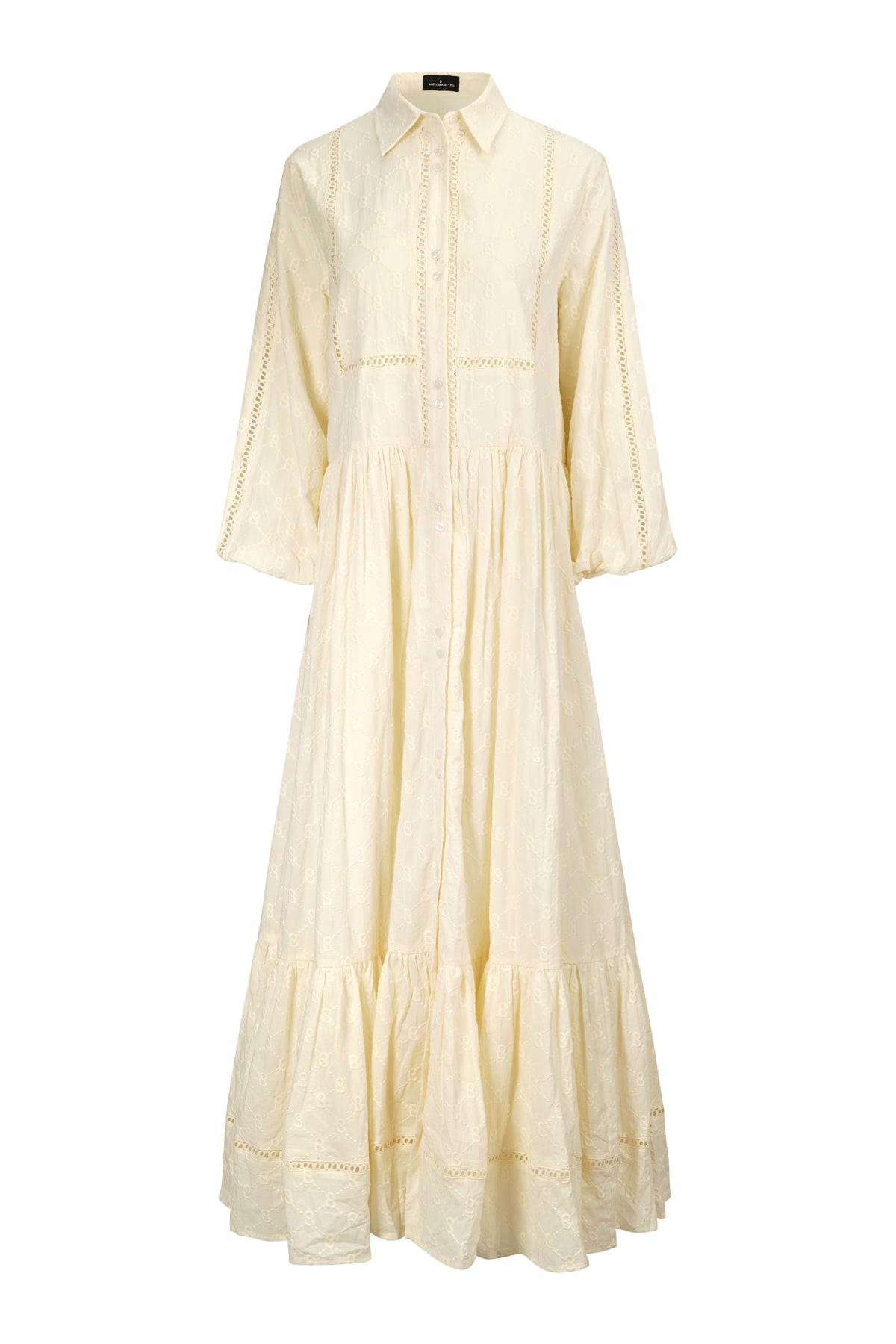 This shirt dress showcases the iconic Beverly monogram pattern with elegant lace trim detailing. Designed with front-opening buttons for easy wear, its ruffled hem adds a soft, flowing finish.