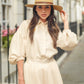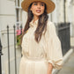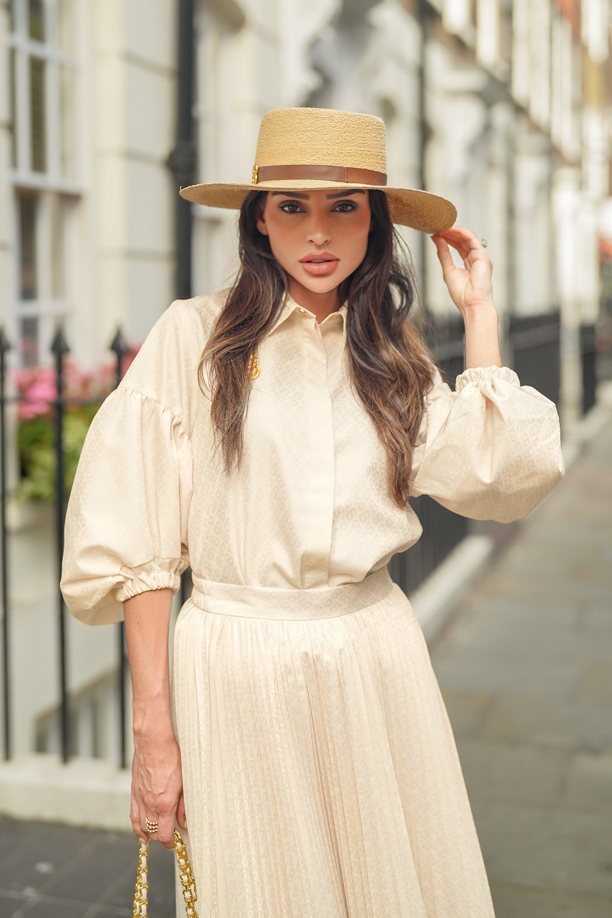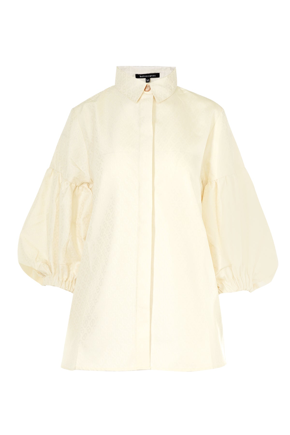 As the highlight from the 2023 Jakarta Fashion Week, this shirt perfectly marries classic sophistication with a contemporary twist. It features the signature monogram "B" embossed onto the fabric. The puffy sleeves lend an air of femininity and playfulness to the design, creating a delightful contrast with the classic collar.