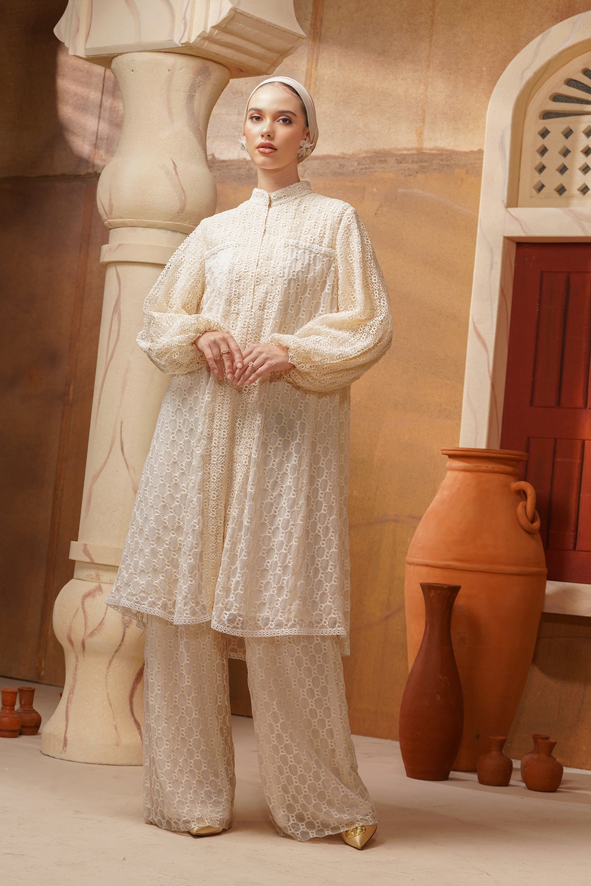 Exclusive Raya collection, this outerwear is crafted with exquisite signature monogram lace embroidery. It features hidden front hook opening, puff sleeves, and a high neck to create a regal silhouette. Make a statement this festive season with this stunning piece.