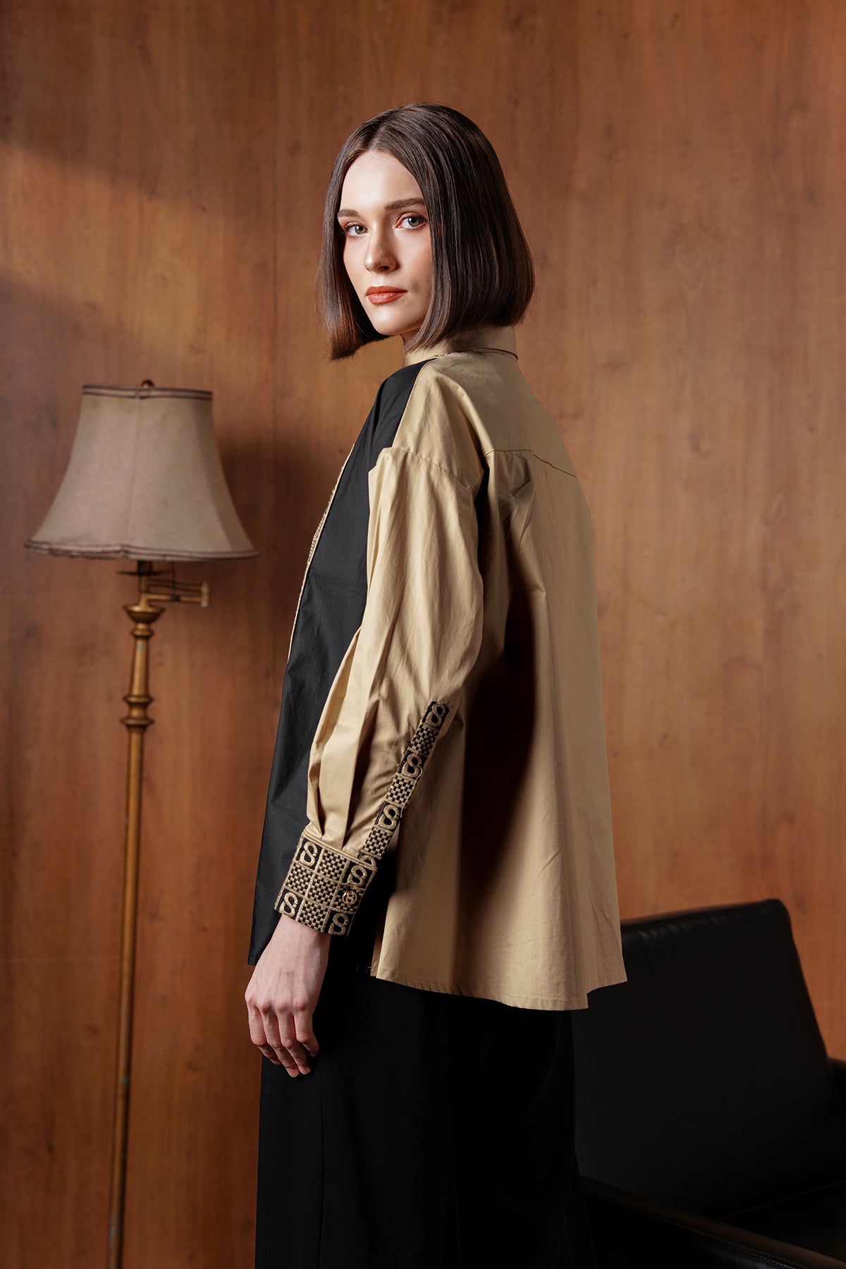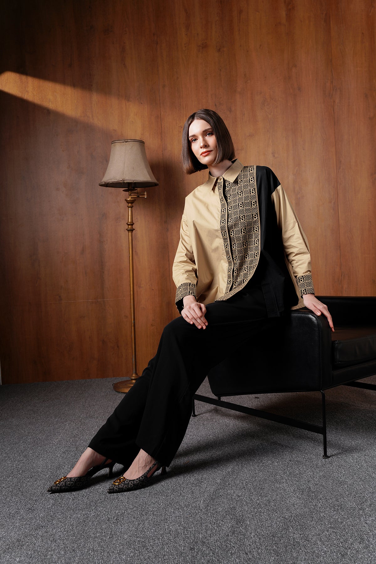 Adorned with our signature monogram plaid pattern at one side, this shirt exudes sophistication with a modern twist. The hidden front opening buttons maintain a sleek and seamless look, while the classic collar adorned with a gold button adds a touch of luxury.
