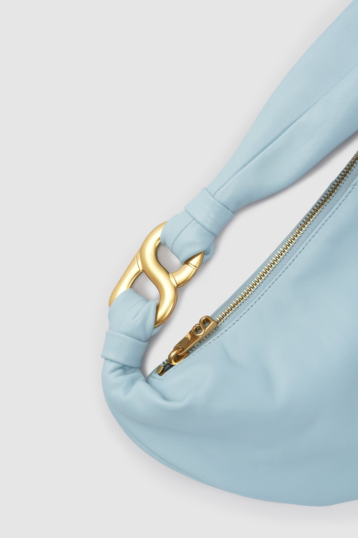 A crescent-shaped shoulder bag that pairs refined style with everyday ease. Made from supple smooth cow leather, it has a naturally slouched silhouette that sits comfortably whether you wear it over the shoulder or carry it by hand. The front is finished with a subtle metal “B” logo, while the knotted strap accented with a gold “B” hardware adds both charm and practicality.