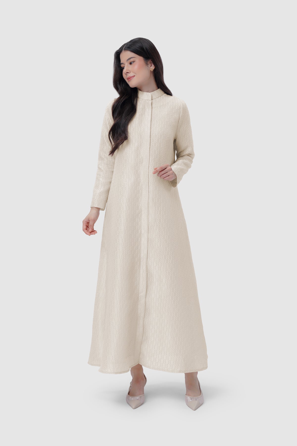 Crafted from jacquard fabric with a subtle monogram texture, this full length dress is designed in a minimalist silhouette. The high neckline and concealed front placket create a seamless finish, while the long sleeves and softly flared A line cut offer graceful movement with every step. Suitable for formal gatherings, professional settings, and elevated everyday wear.