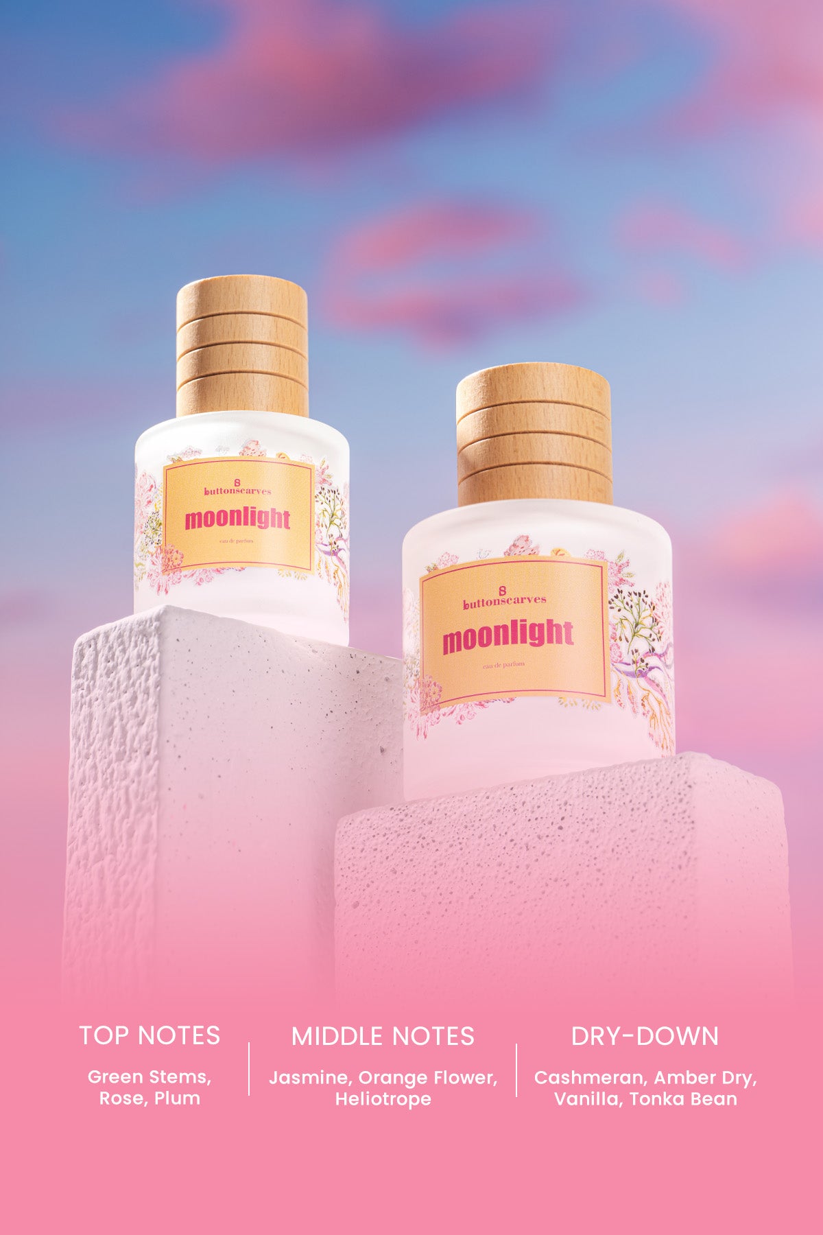 A daring and opulent scent that opens with a fresh burst of green stems, complemented by the delicate and romantic scent of rose and the sweetness of ripe plum. It reveals a heart of jasmine, orange flower, and powdery notes of heliotrope. The dry-down leaves a lasting impression with a warm blend of cashmeran, amber dry, vanilla, and tonka bean. It captures the enchanting beauty of moonlit summer nights, offering a perfect balance of fresh floral and warm, sweet scents.