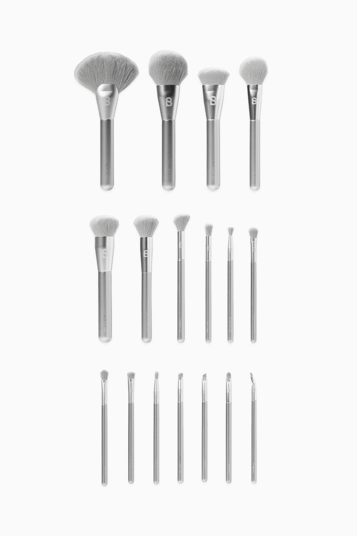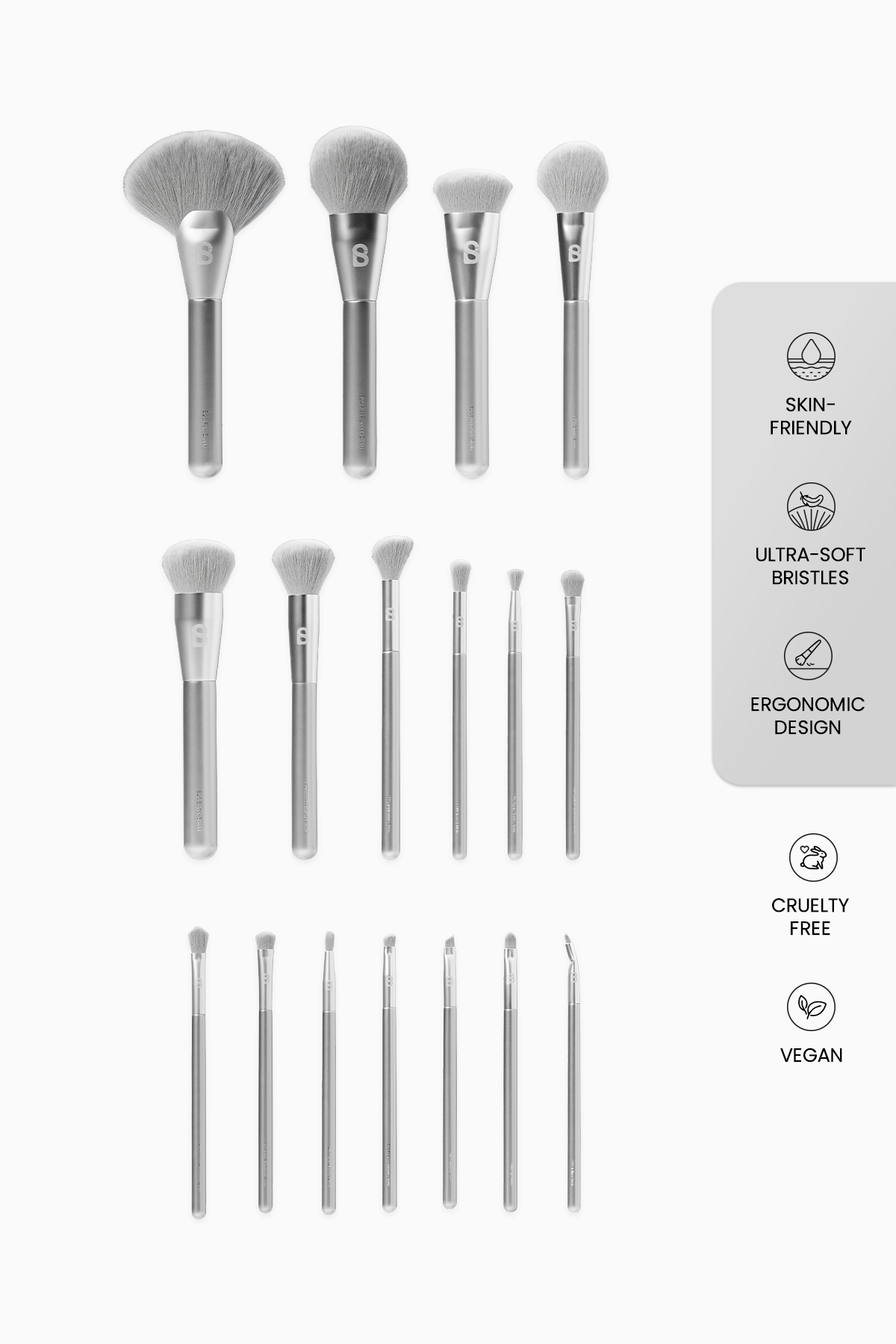 The Makeup Brush Collection features 17 ultra-soft, high-performance brushes designed for complexion, cheeks, and eyes. Crafted with high-grade corn synthetic hair, the bristles are vegan, cruelty-free, and safe for sensitive skin. PBT fibers are known for their durability, easy cleaning, and professional performance, providing flawless product pick-up and laydown without absorbing excess formula or shedding.