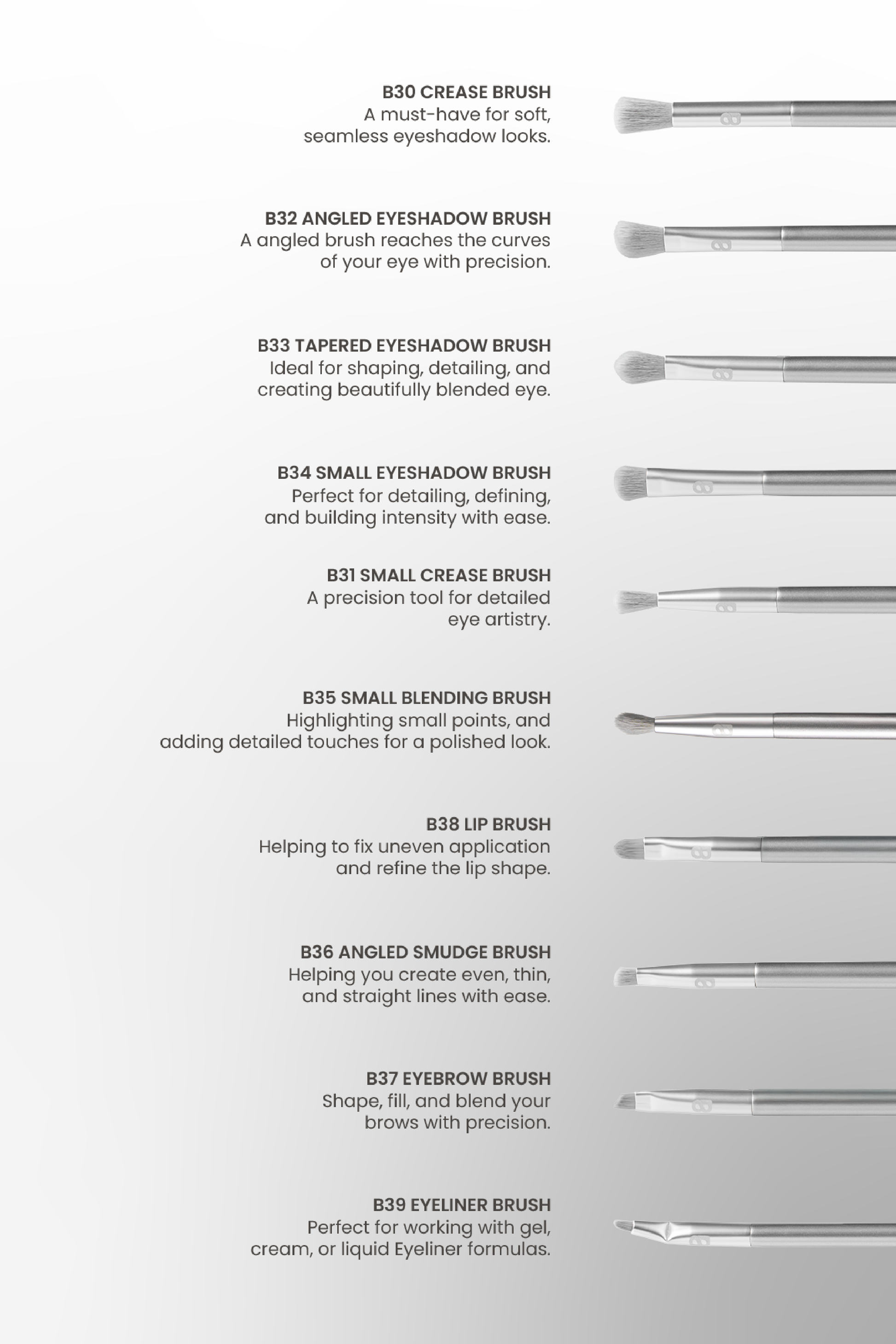- B30 CREASE BRUSH : A must-have for soft, seamless eyeshadow looks. Designed to glide naturally along the crease, this brush blends and diffuses color effortlessly for a beautifully blurred finish.