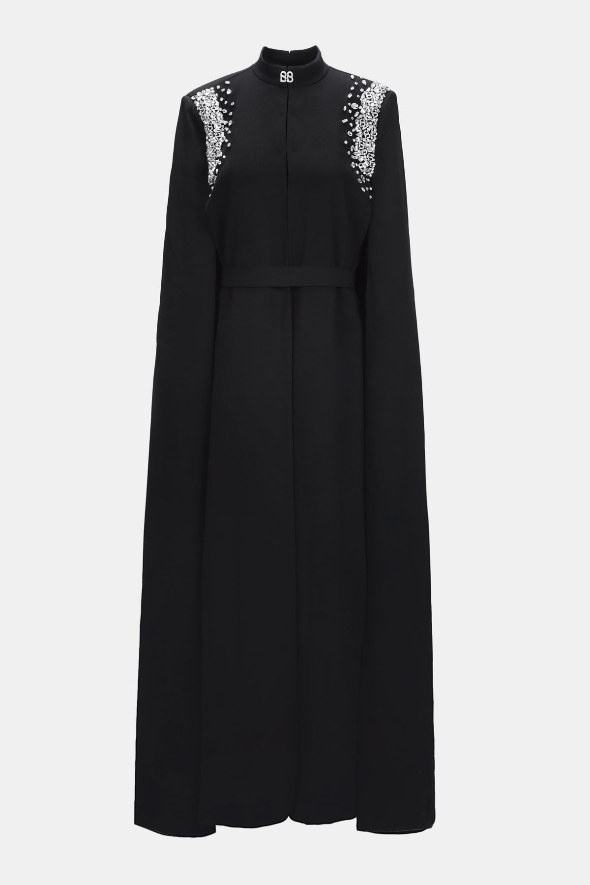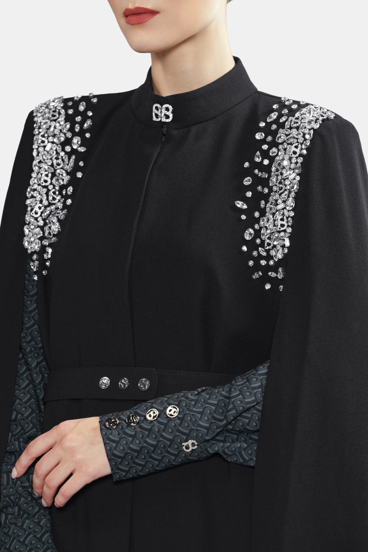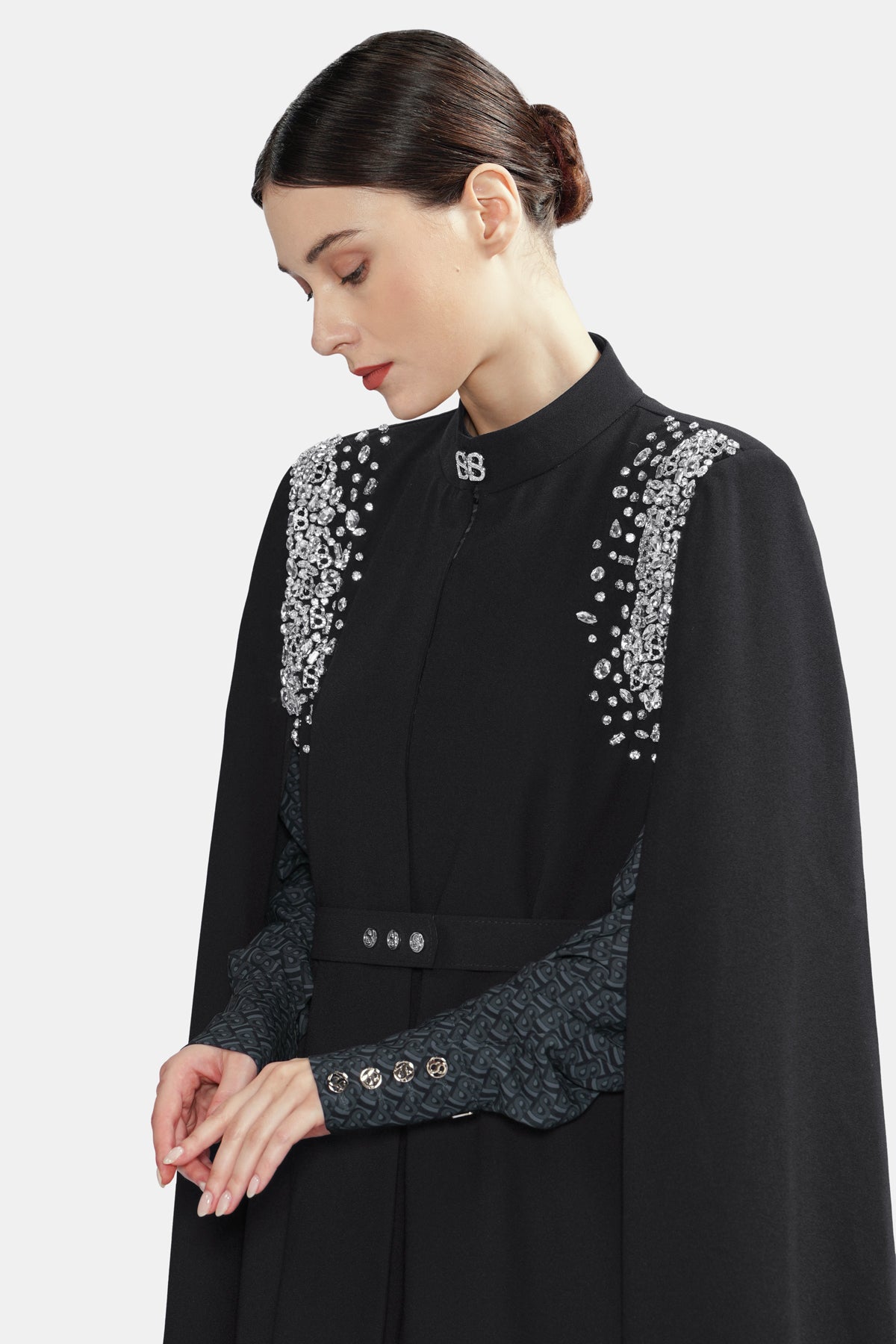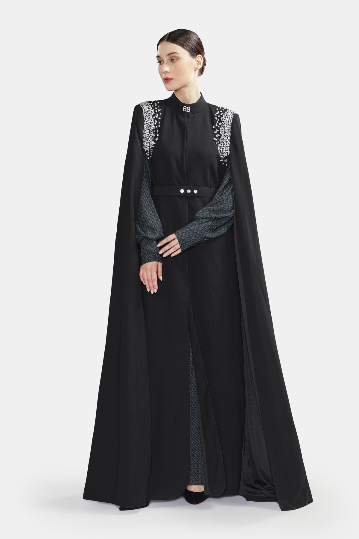 Designed to make a statement with its flowing cape silhouette and adorned with lavish embellishment beads on the shoulders. It features a Deux Logo clasp at the neckline and a belt that cinches the waist, perfect for the Raya season.