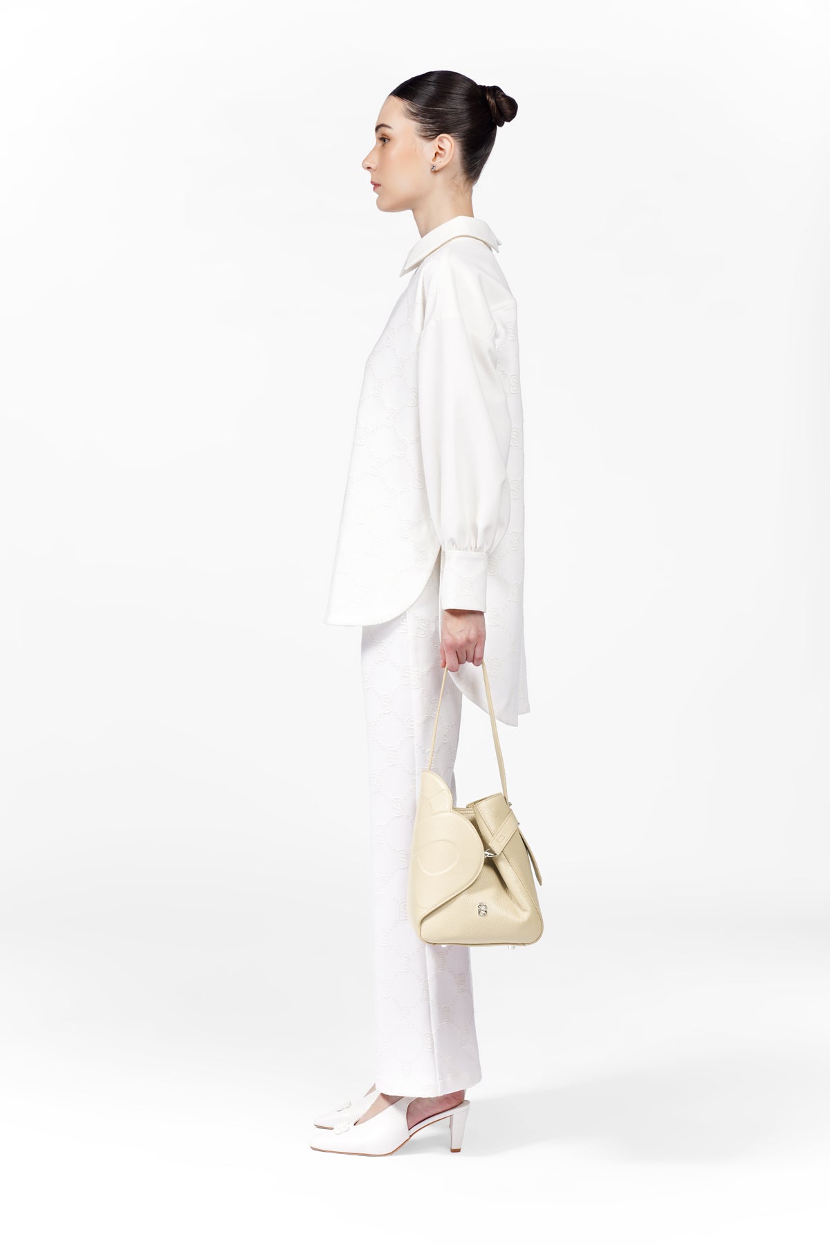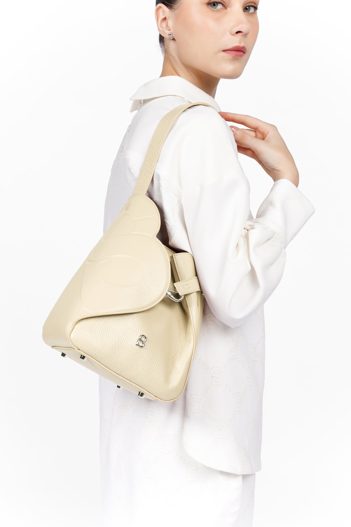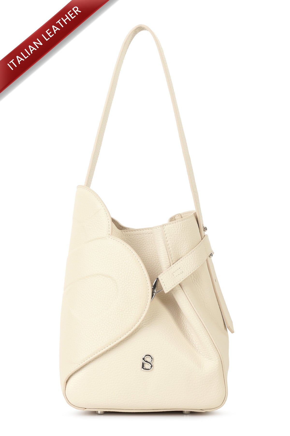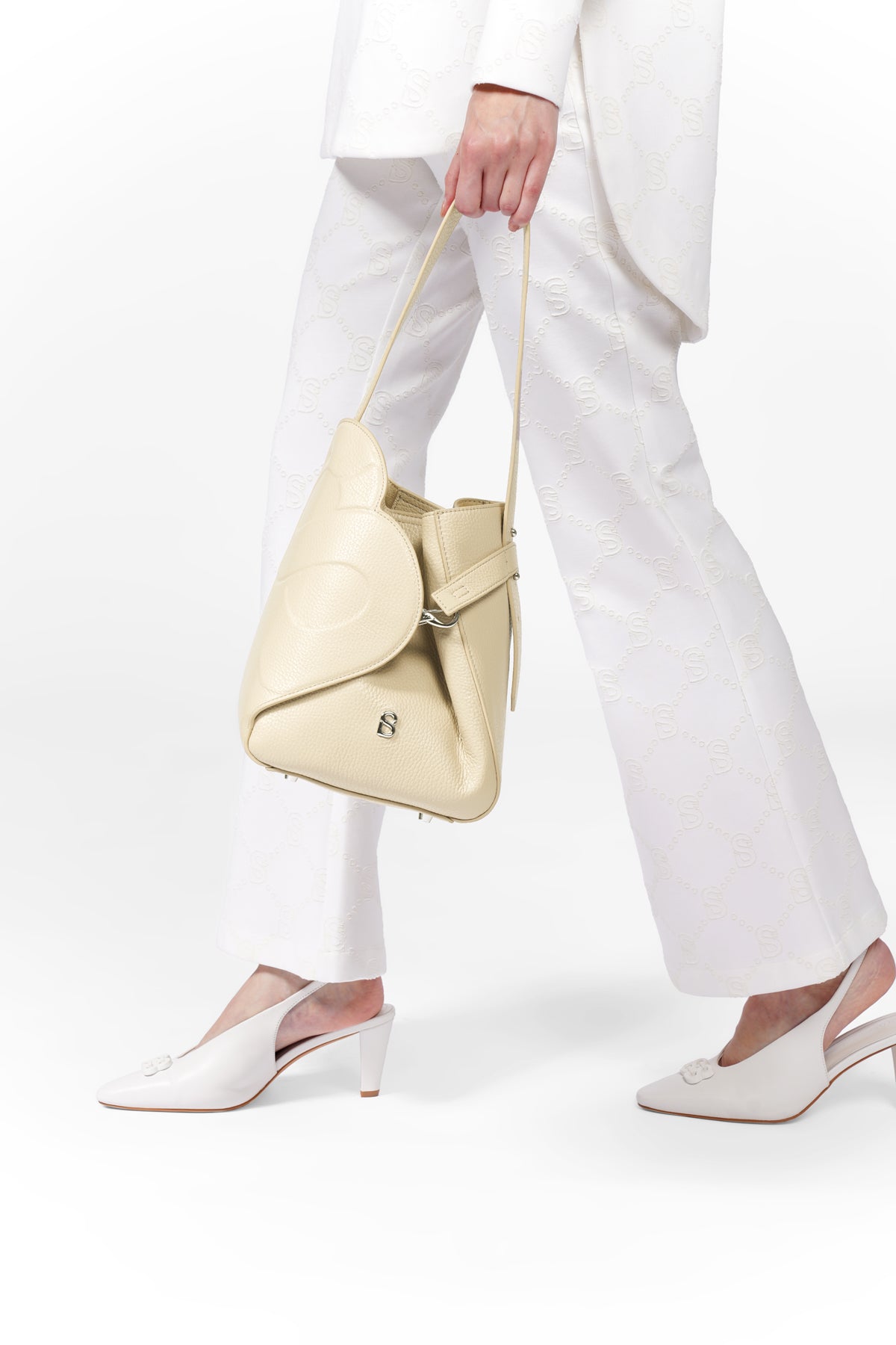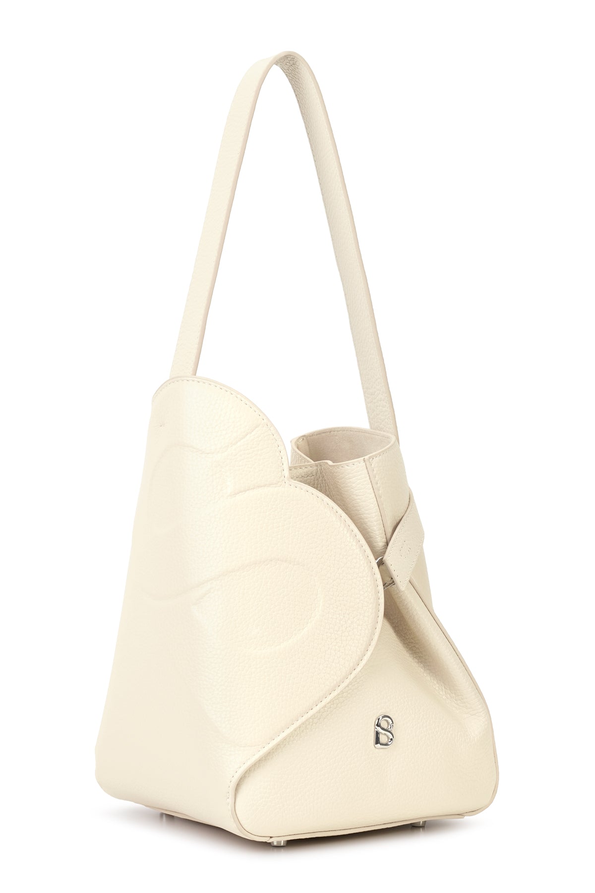 Meticulously crafted from high-quality Italian cow leather. Designed in a folded style bucket bag silhouette, embellished with the embossed signature B logo, this piece exudes sophistication and elegance.