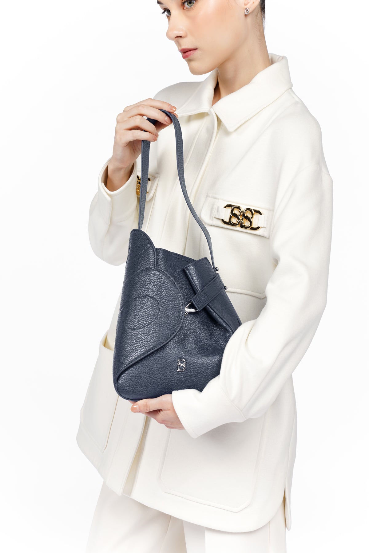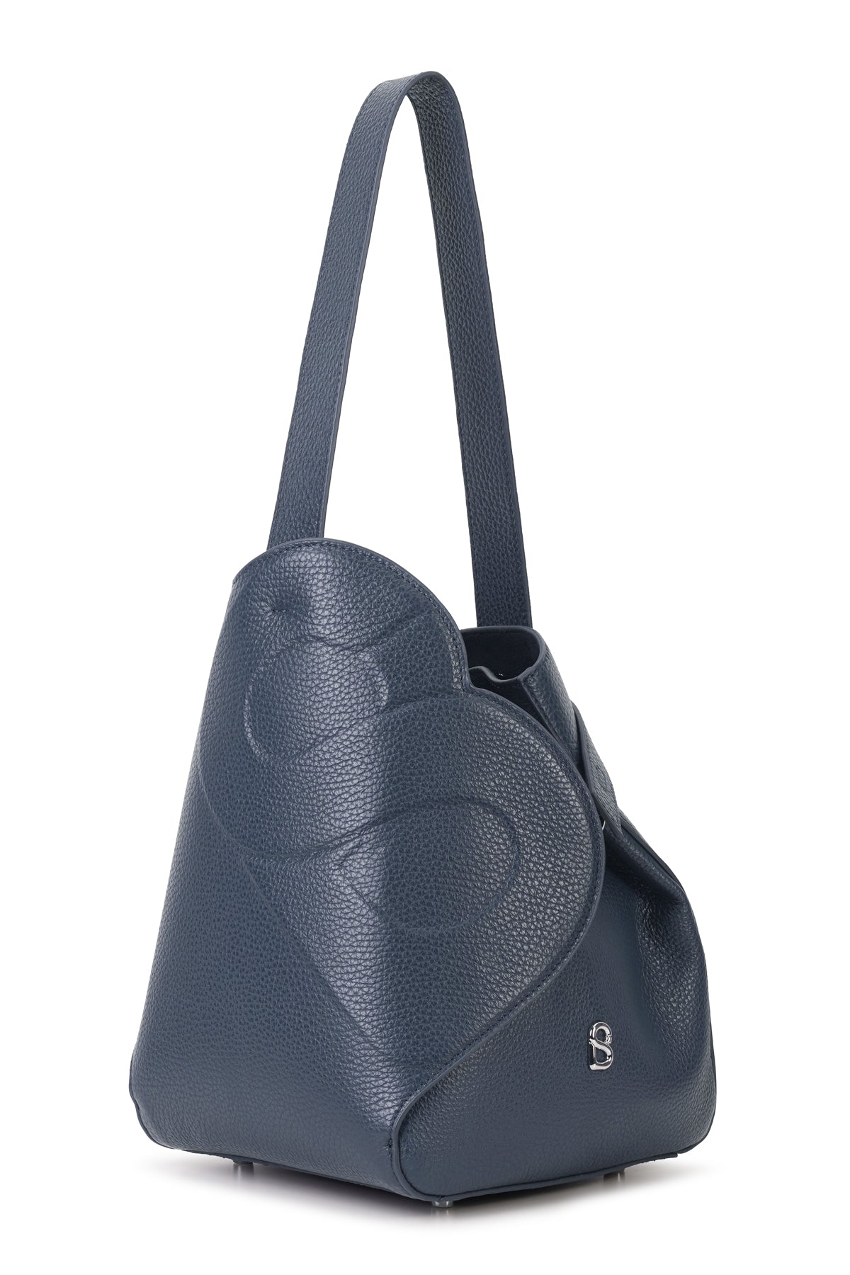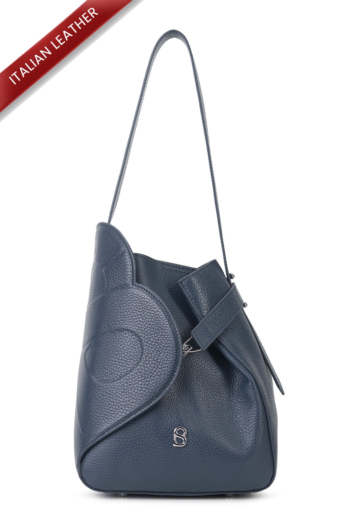 Meticulously crafted from high-quality Italian cow leather. Designed in a folded style bucket bag silhouette, embellished with the embossed signature B logo, this piece exudes sophistication and elegance.