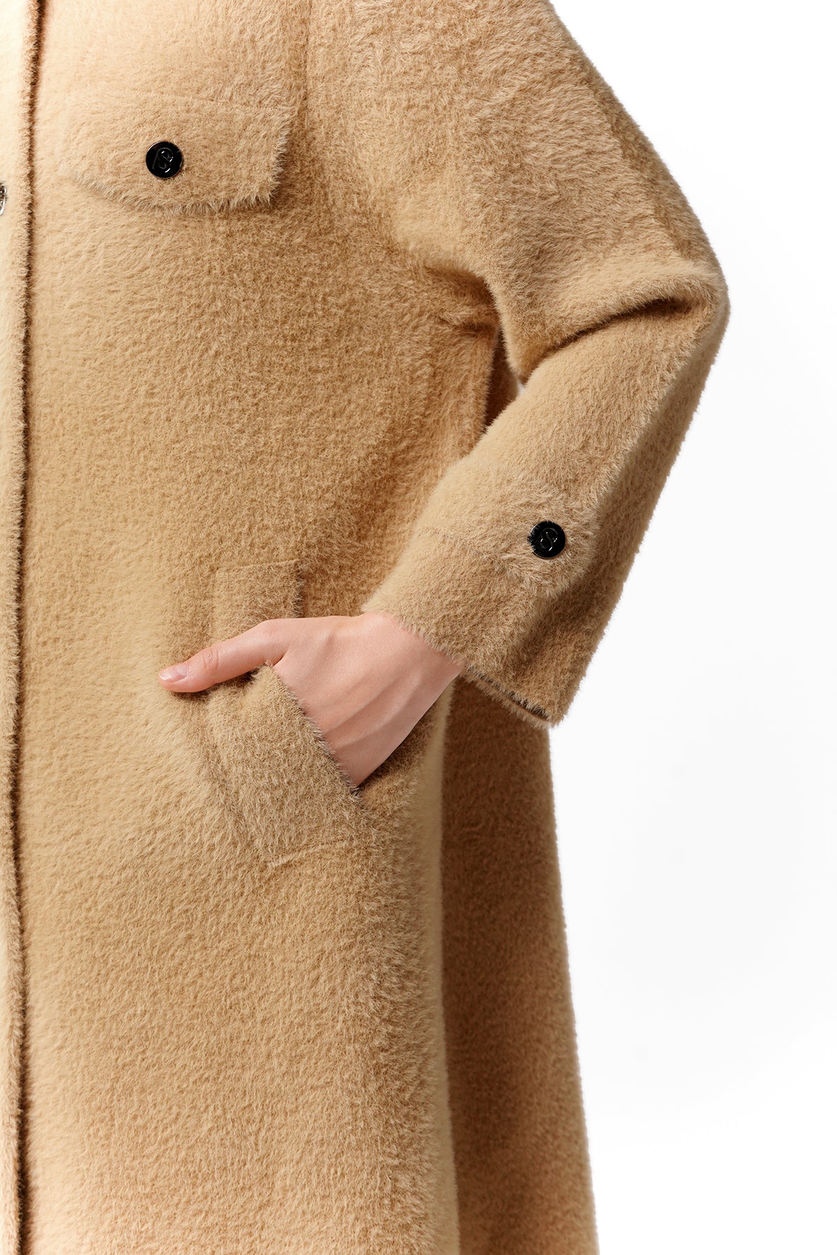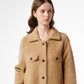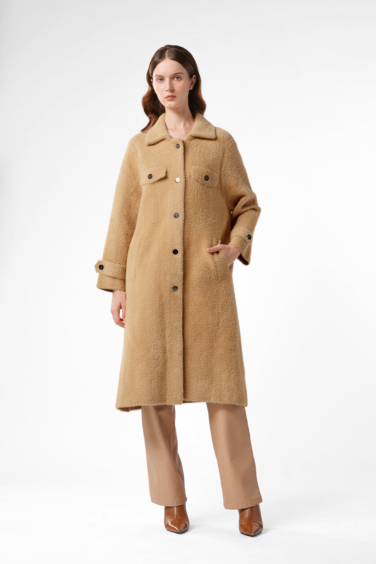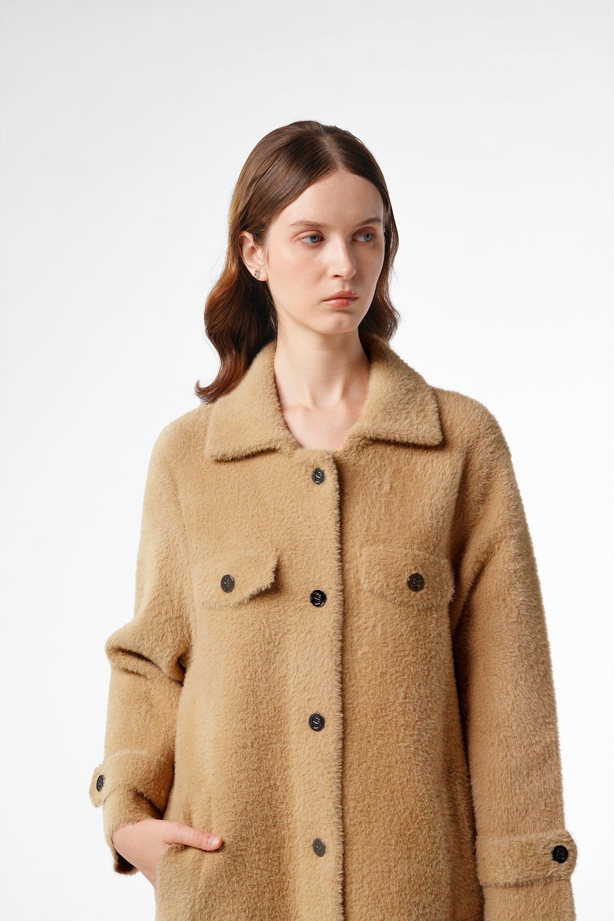 Crafted from a soft and textured fabric that offers both comfort and sophistication, this coat features an edgy collar, front button closures, and dual chest pockets with button accents, adding a refined touch to its elegant design. Perfect for a layered look, this piece brings a chic, polished finish to any outfit.