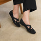 Featuring a slip-on design and rounded toe, these shoes offer effortless elegance for any occasion. The elastic cross straps at the upper ensure a secure fit while adding a touch of flair to your look. Complete with a durable rubber outsole, these shoes are perfect for all-day wear.