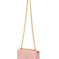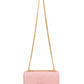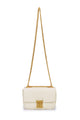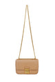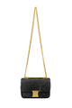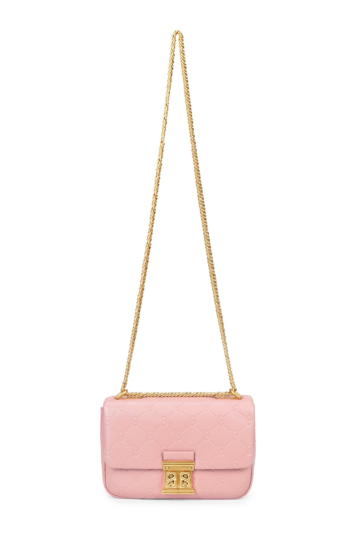 This flap bag boasts an embossed signature monogram, adorned with gold-toned hardware and a chic chain strap. This bag exudes luxury and refinement, perfect for any occasion.