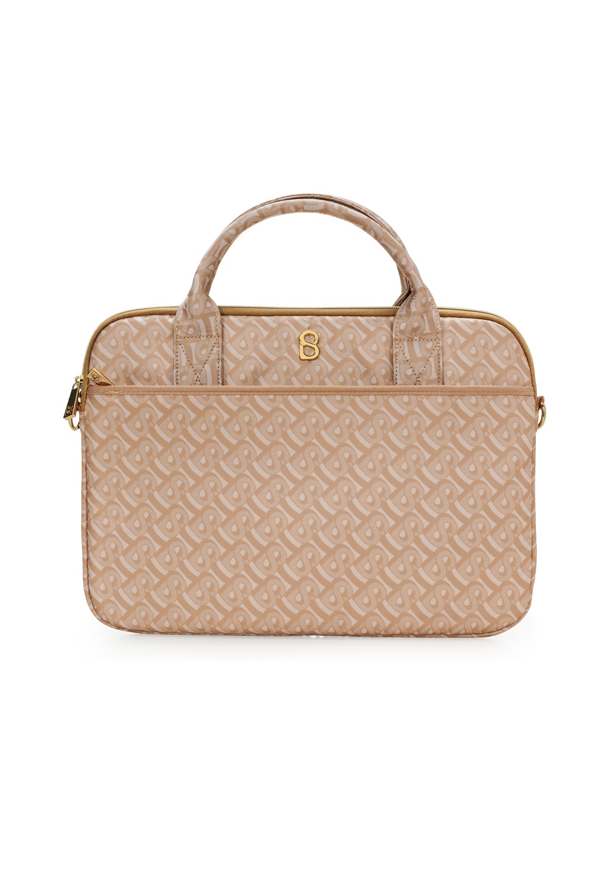 Featuring the distinctive Bimu Monogram print, this bag combines elegance with practicality. It features a padded laptop compartment, open pockets, and card slots that offer organized storage inside.