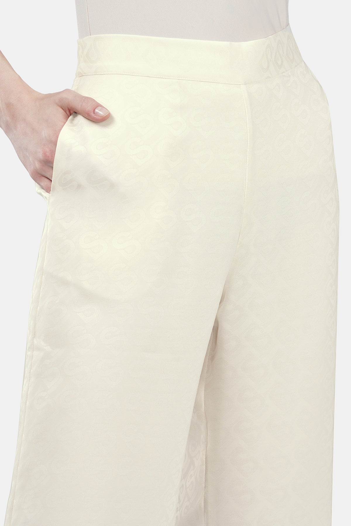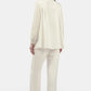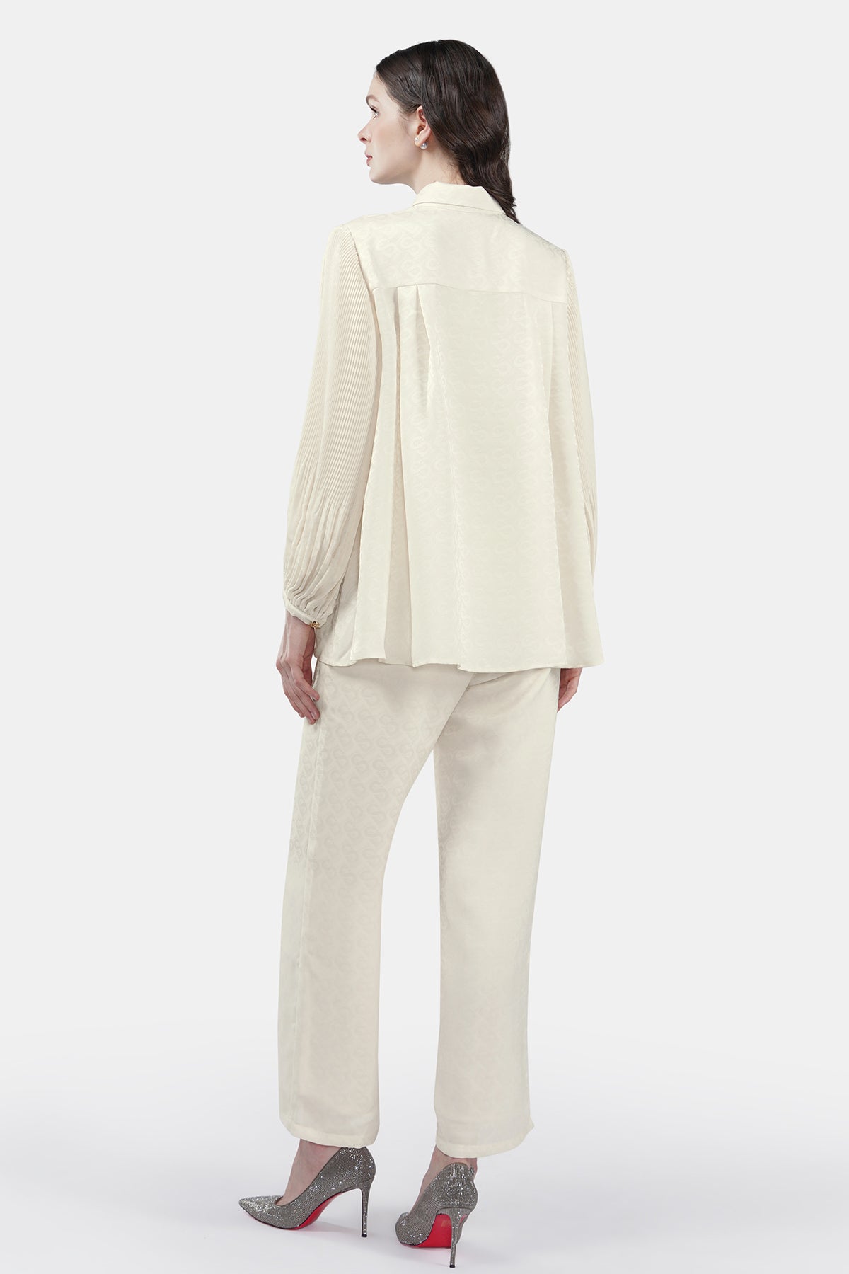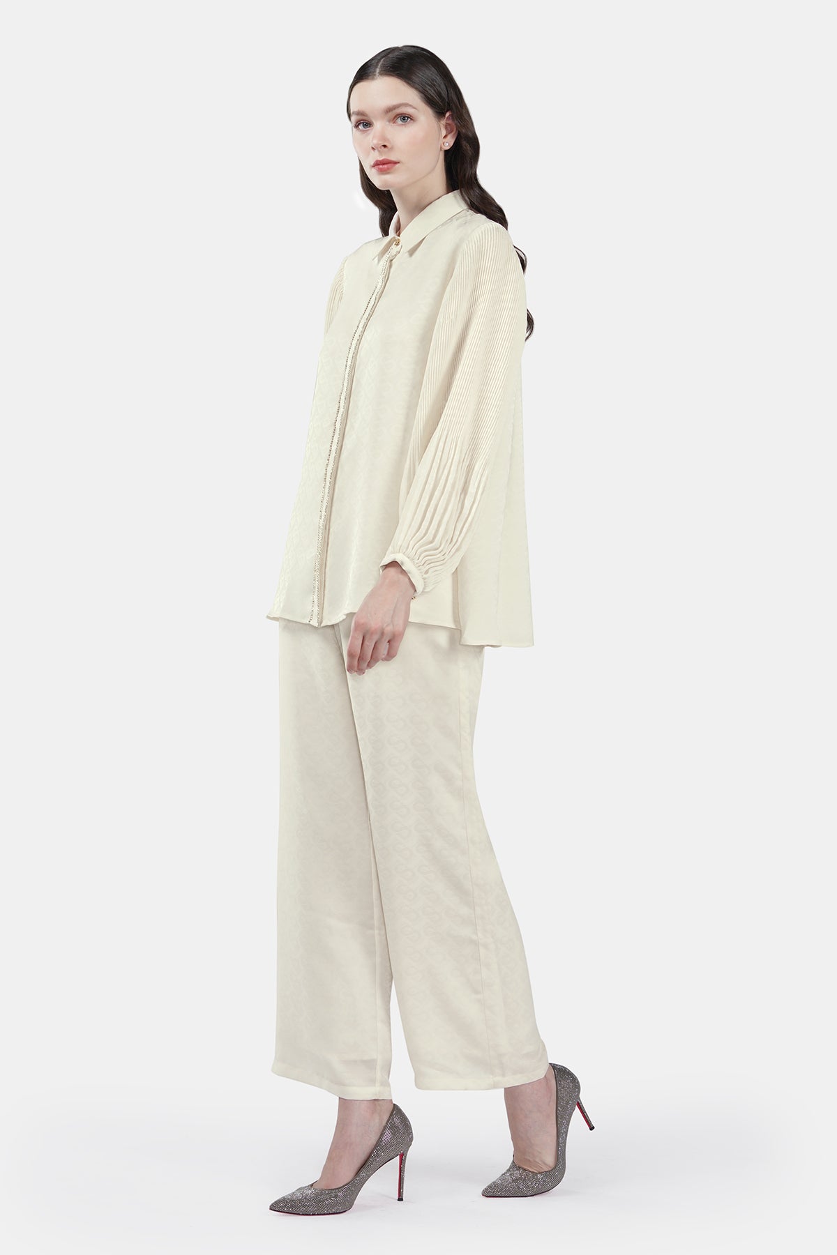A statement of Raya wardrobe, this set includes a tailored shirt and matching pants crafted from soft, lustrous satin with Bimu monogram detailing. The shirt features intricate beading along the concealed placket and elegantly pleated sleeves. Paired with flowing, relaxed-fit pants, this set balances luxury and comfort.