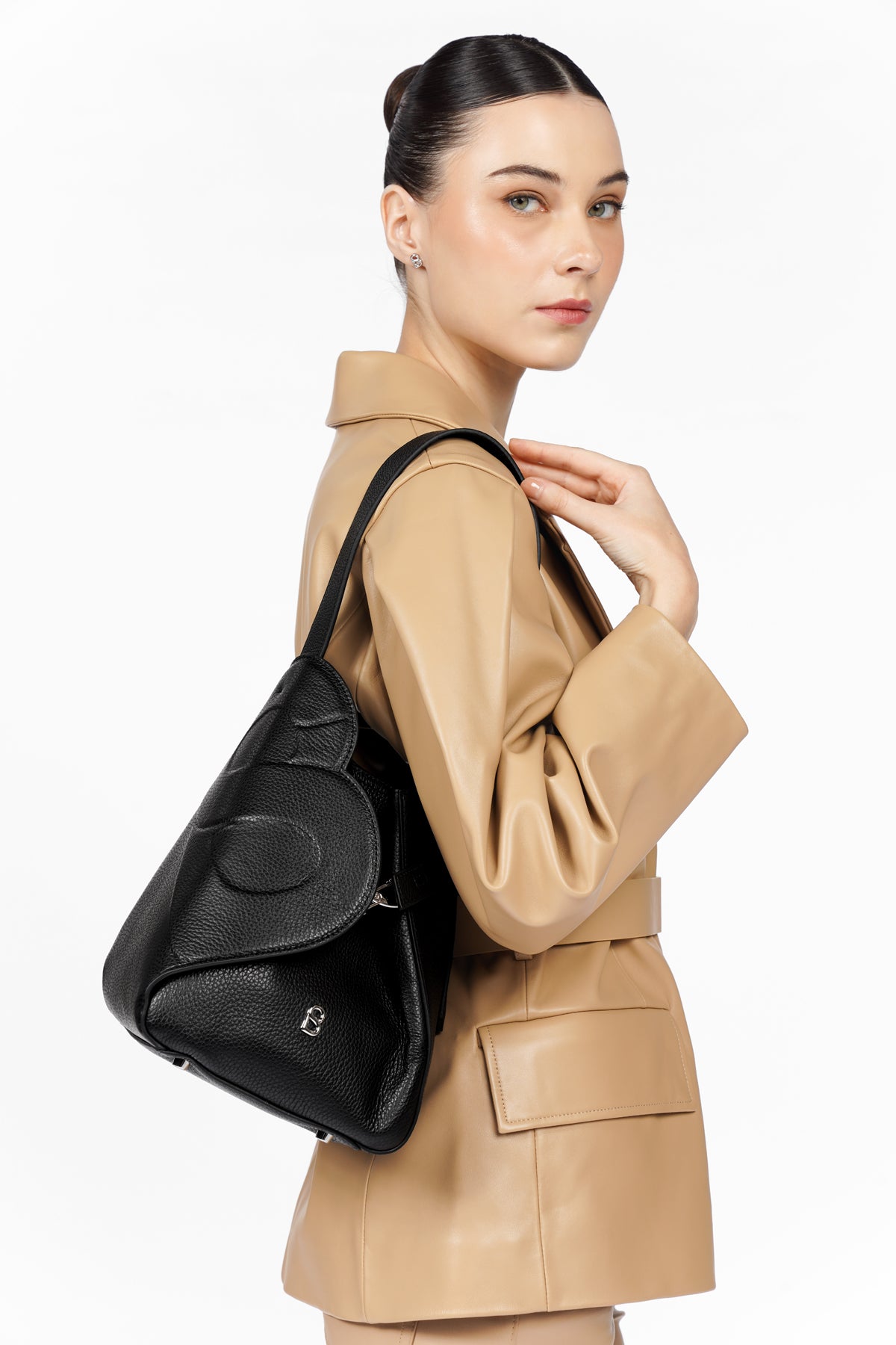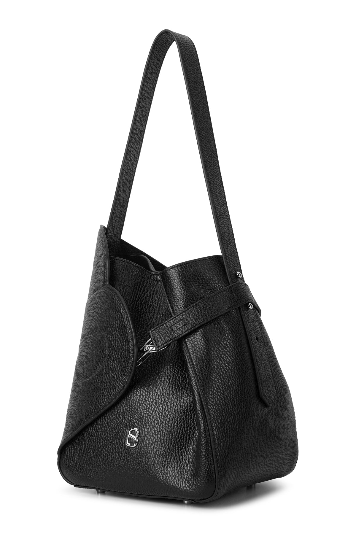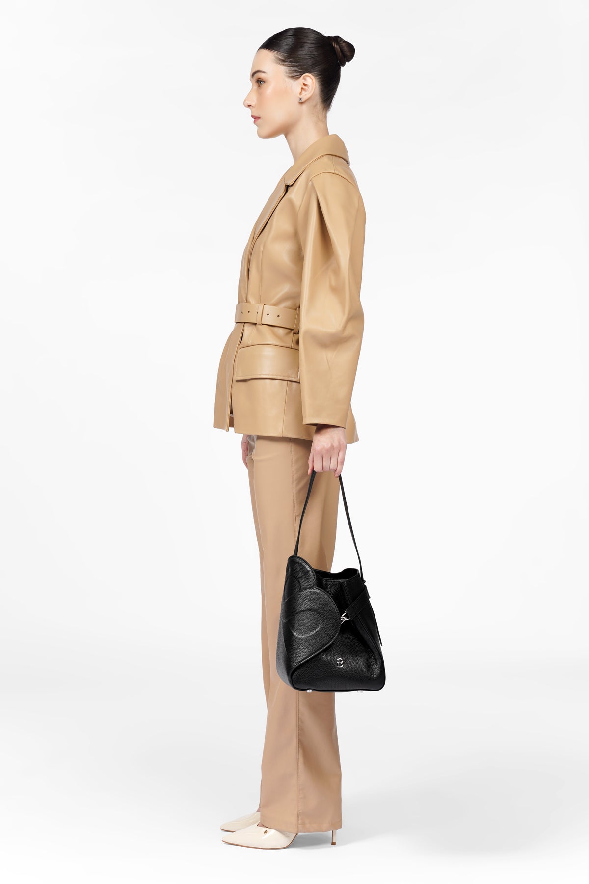 Meticulously crafted from high-quality Italian cow leather. Designed in a folded style bucket bag silhouette, embellished with the embossed signature B logo, this piece exudes sophistication and elegance.