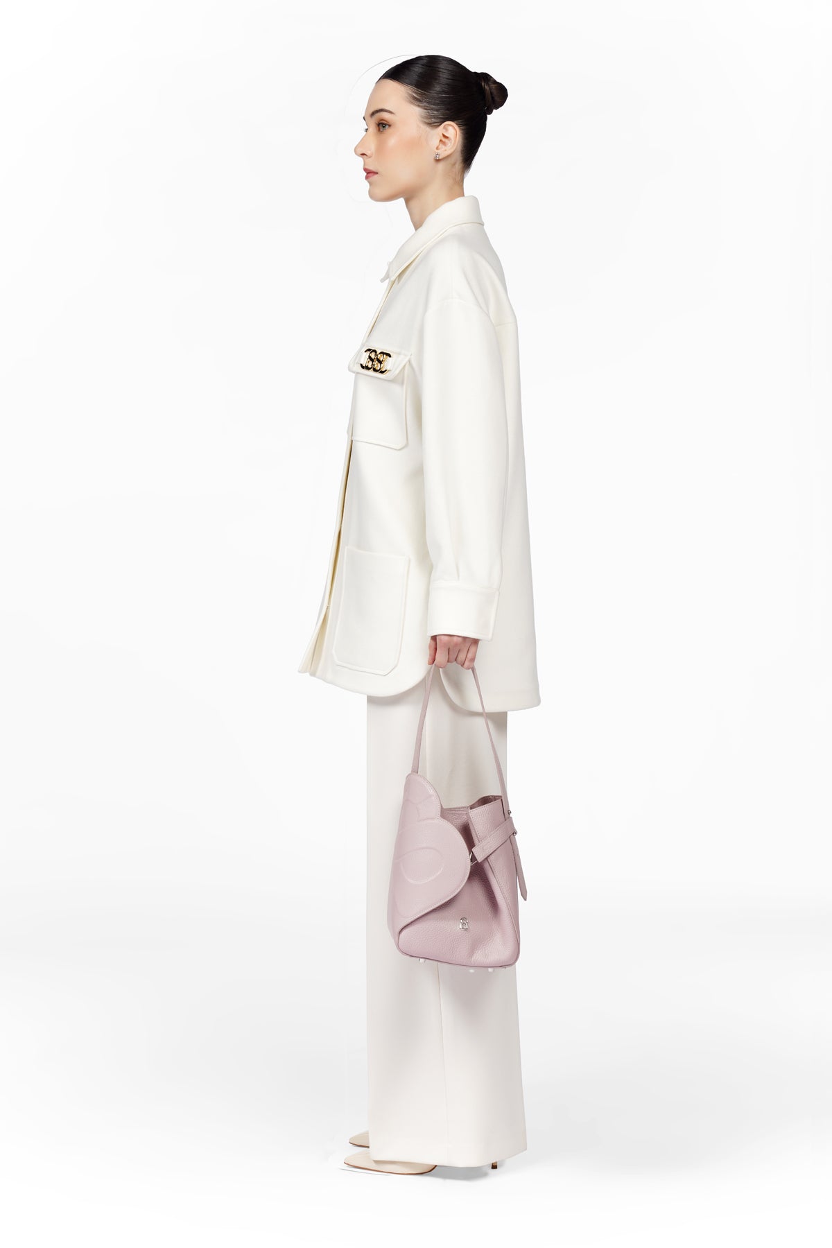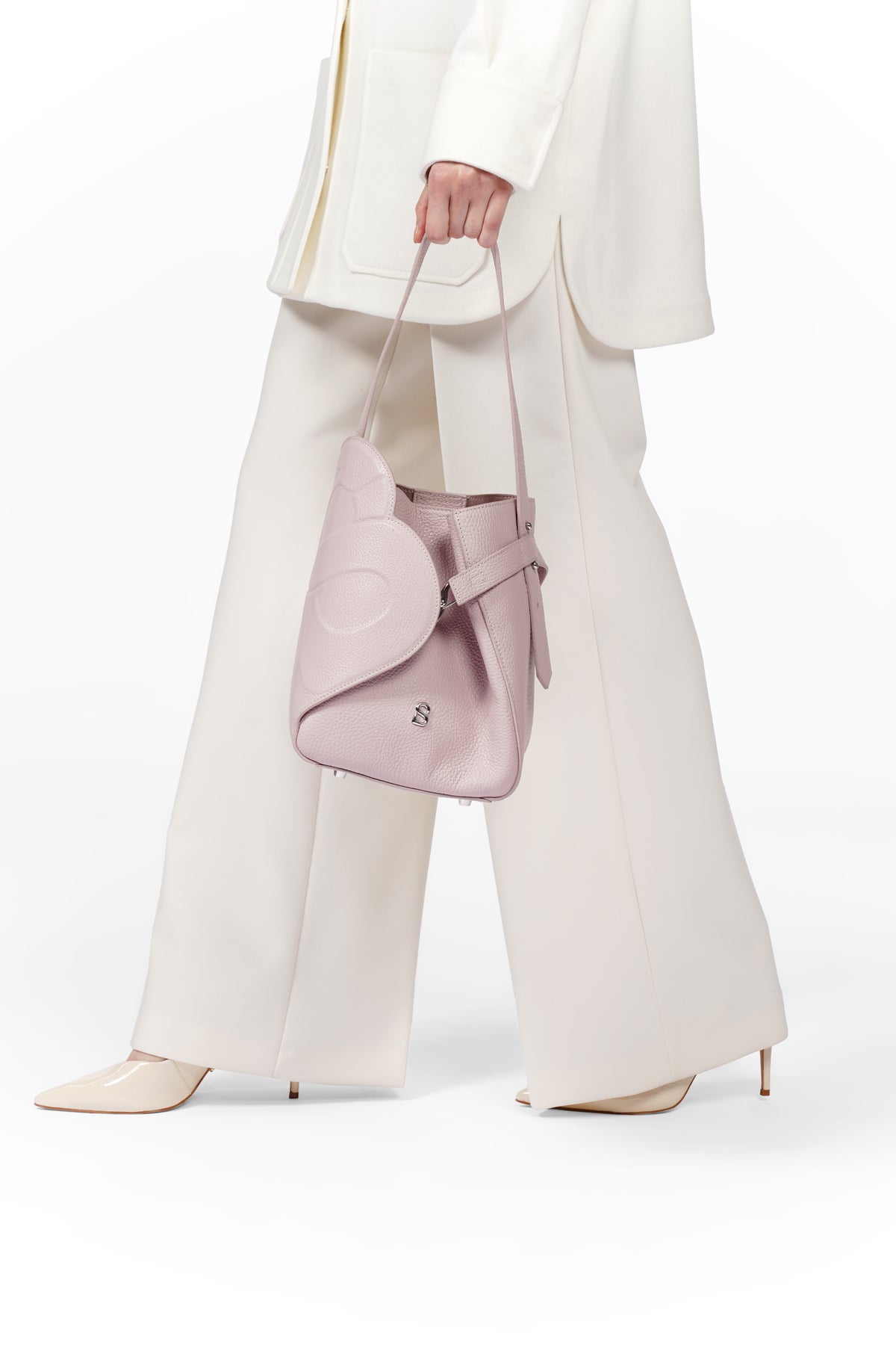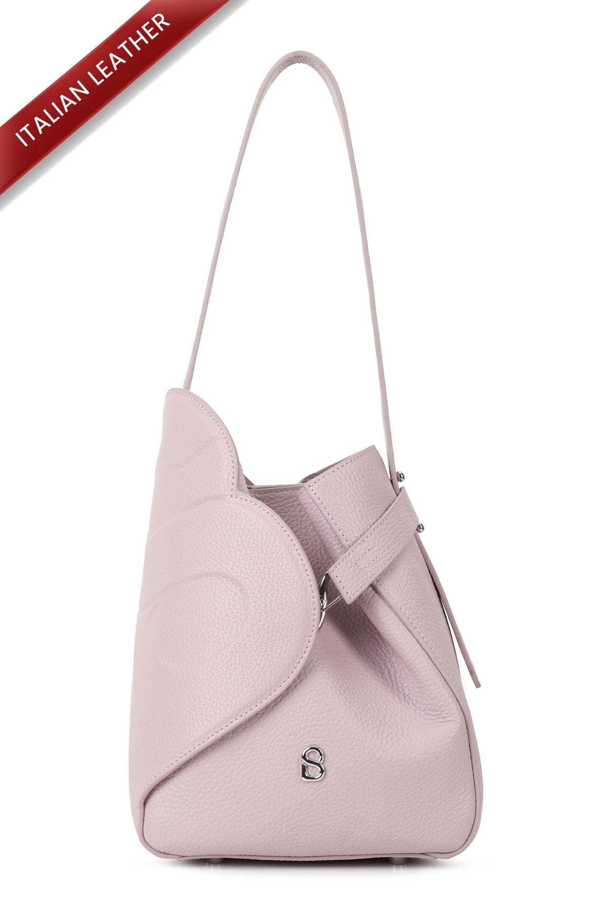 Meticulously crafted from high-quality Italian cow leather. Designed in a folded style bucket bag silhouette, embellished with the embossed signature B logo, this piece exudes sophistication and elegance.
