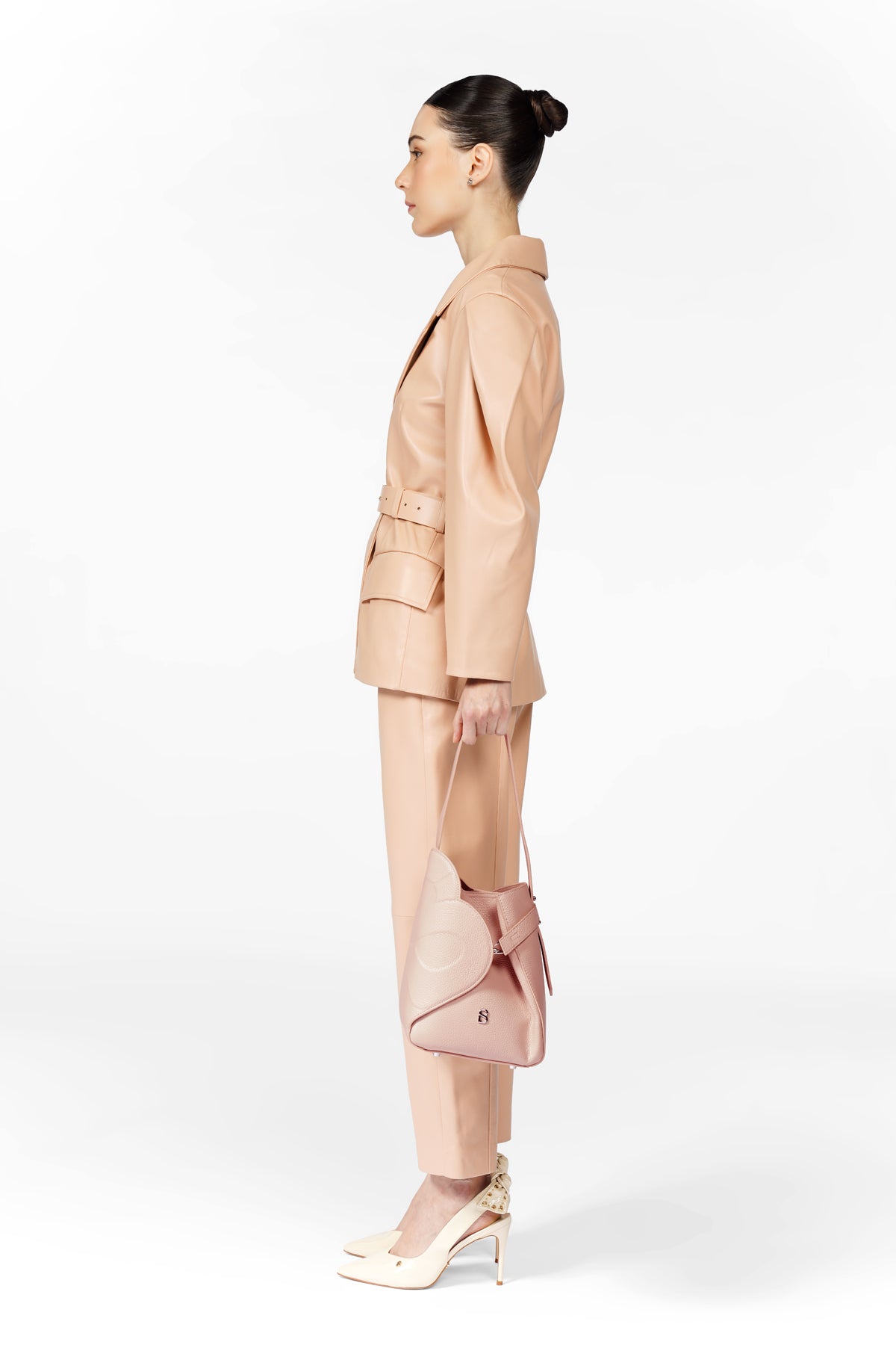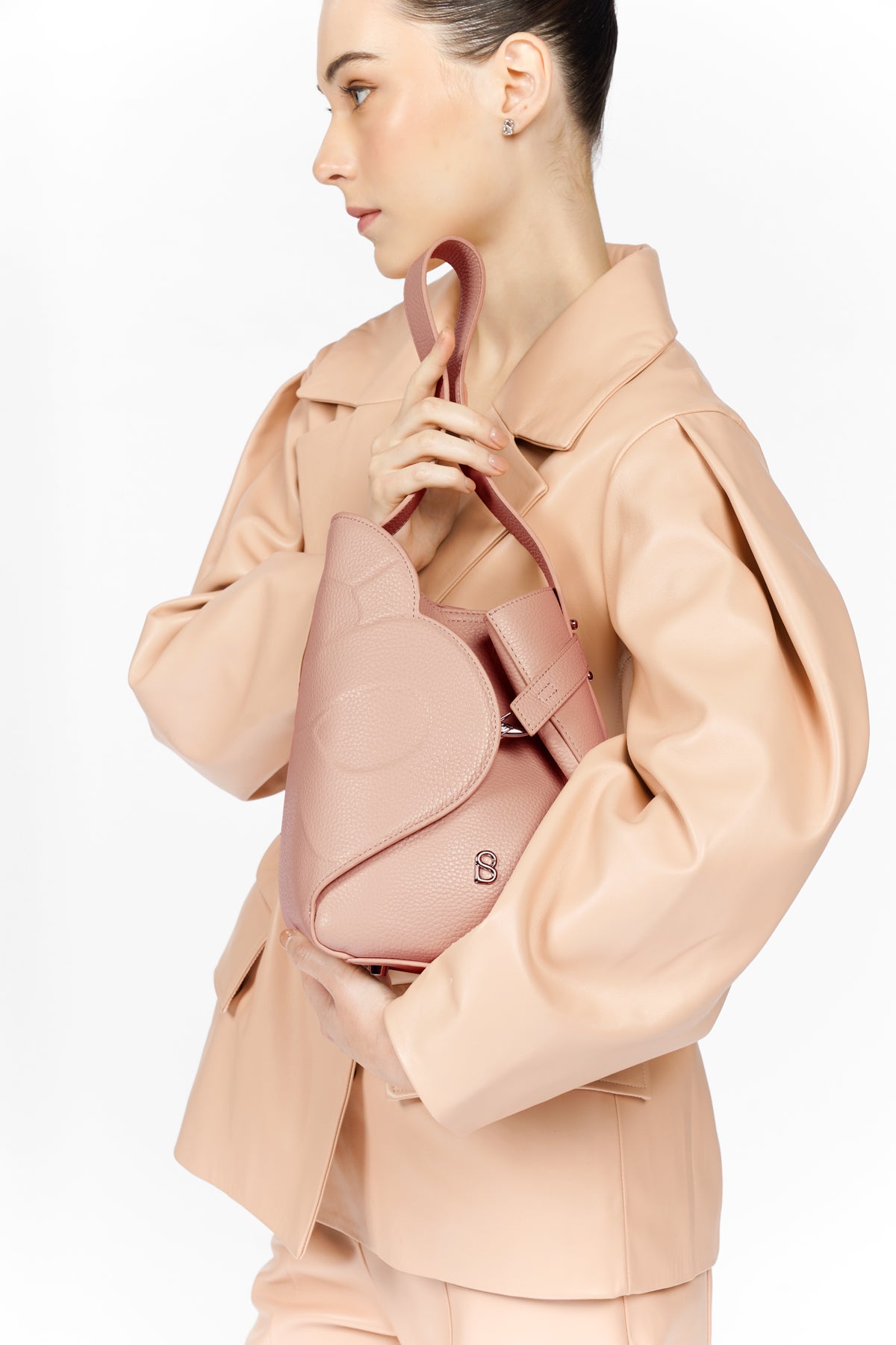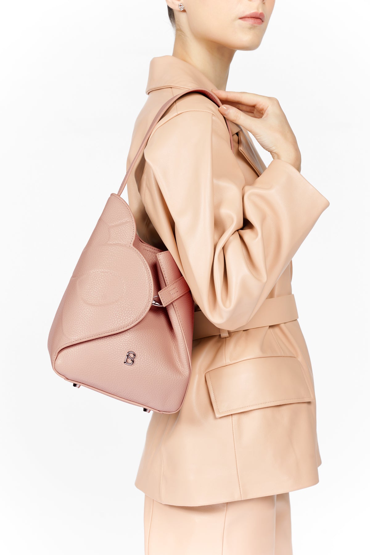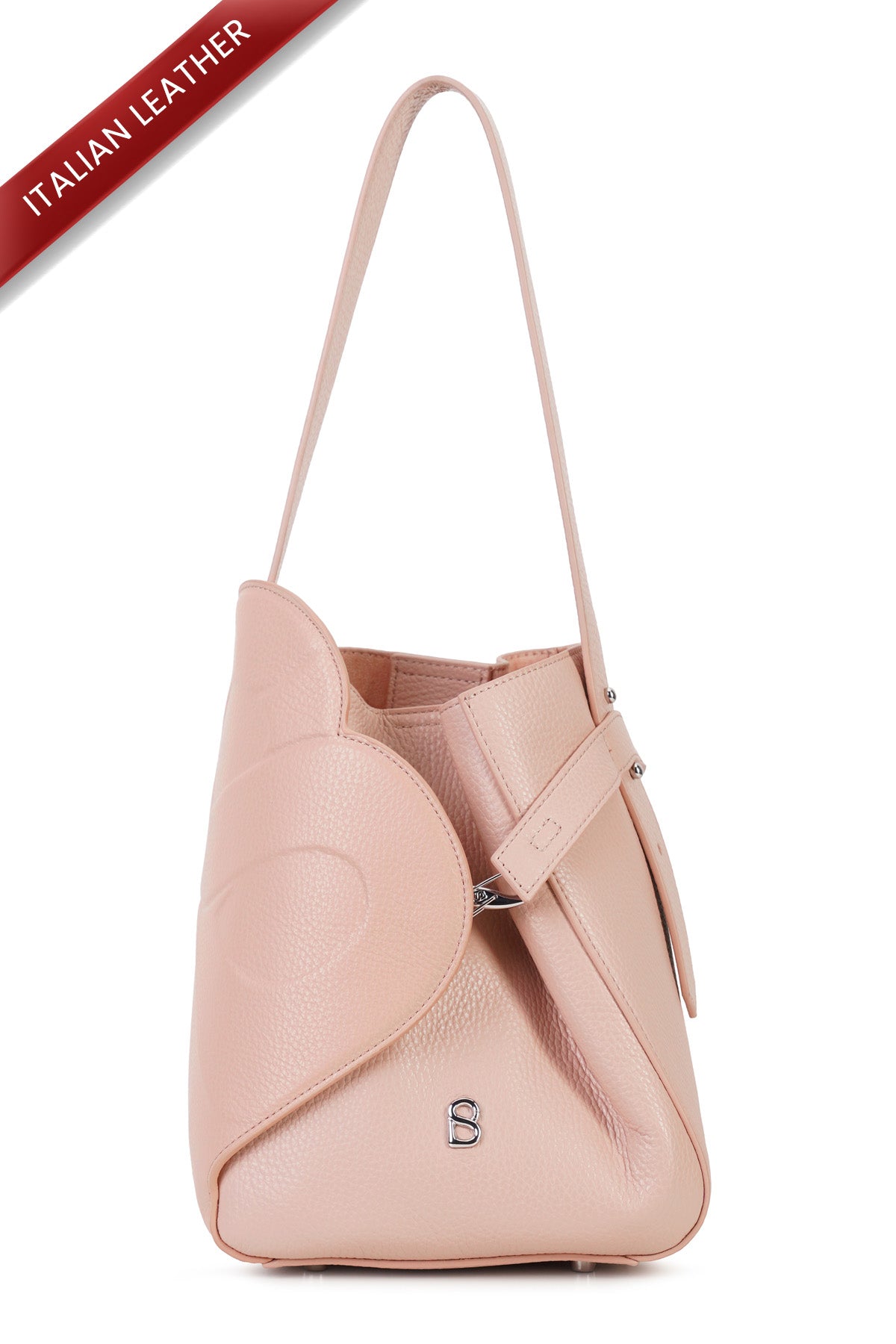 Meticulously crafted from high-quality Italian cow leather. Designed in a folded style bucket bag silhouette, embellished with the embossed signature B logo, this piece exudes sophistication and elegance.