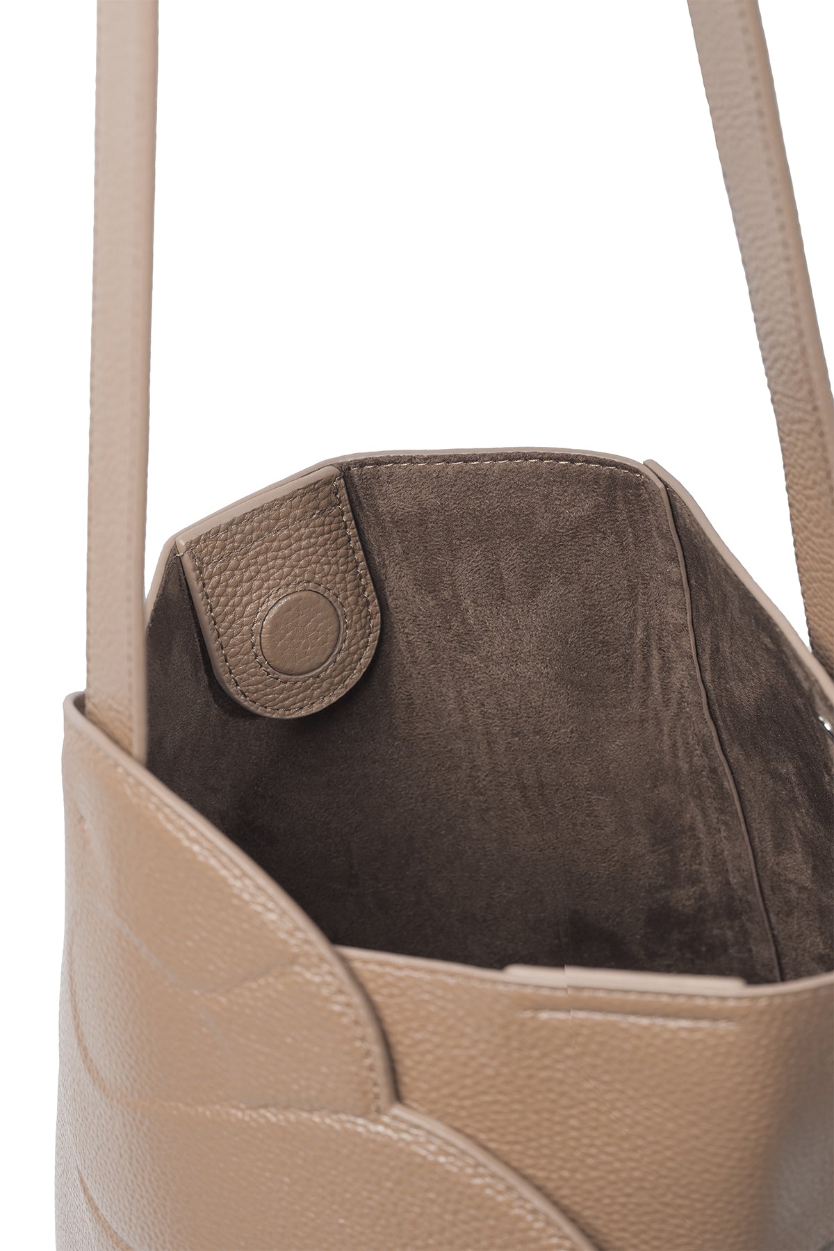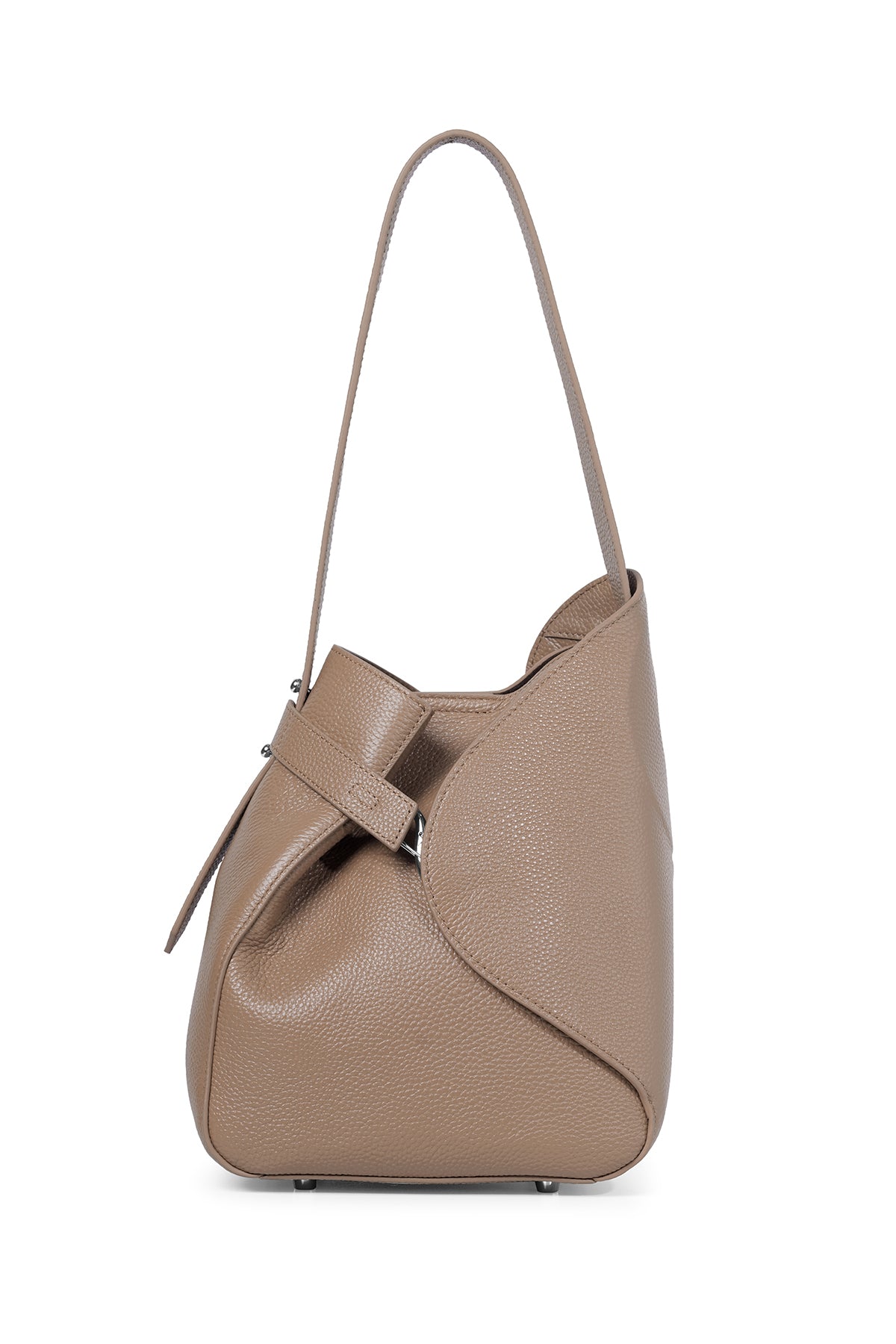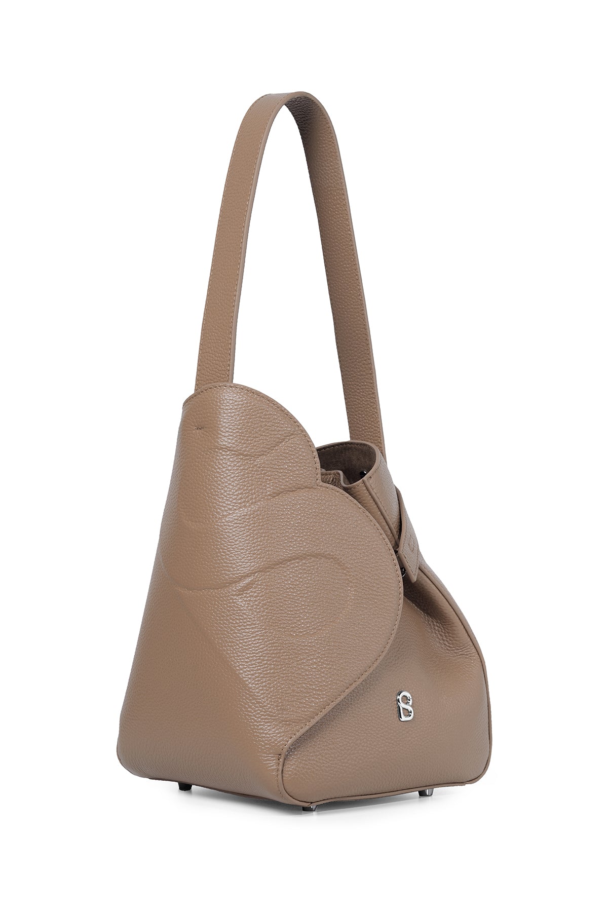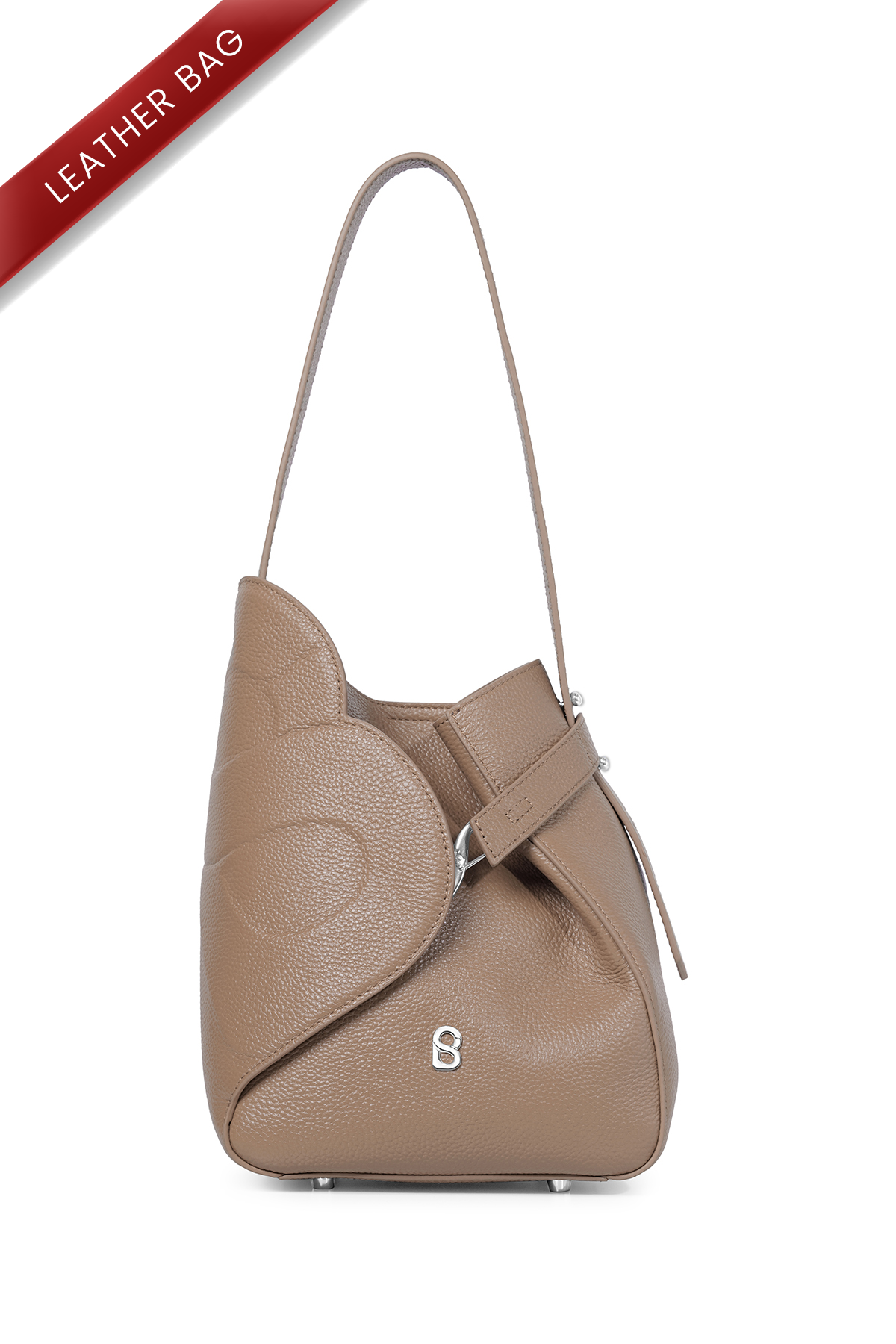 Meticulously crafted from high-quality pebble cow leather. Designed in a folded style bucket bag silhouette, embellished with the embossed signature B logo, this piece exudes sophistication and elegance.