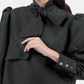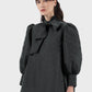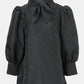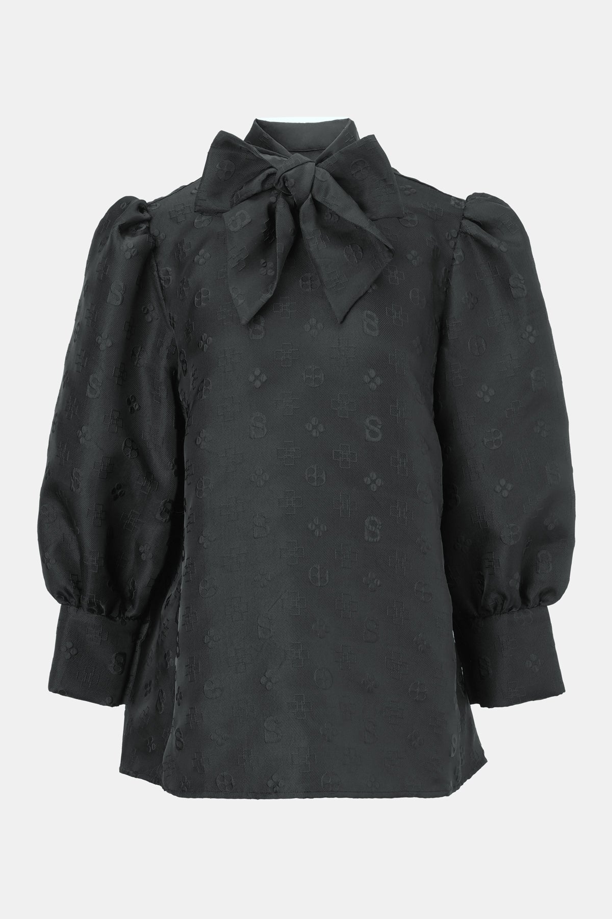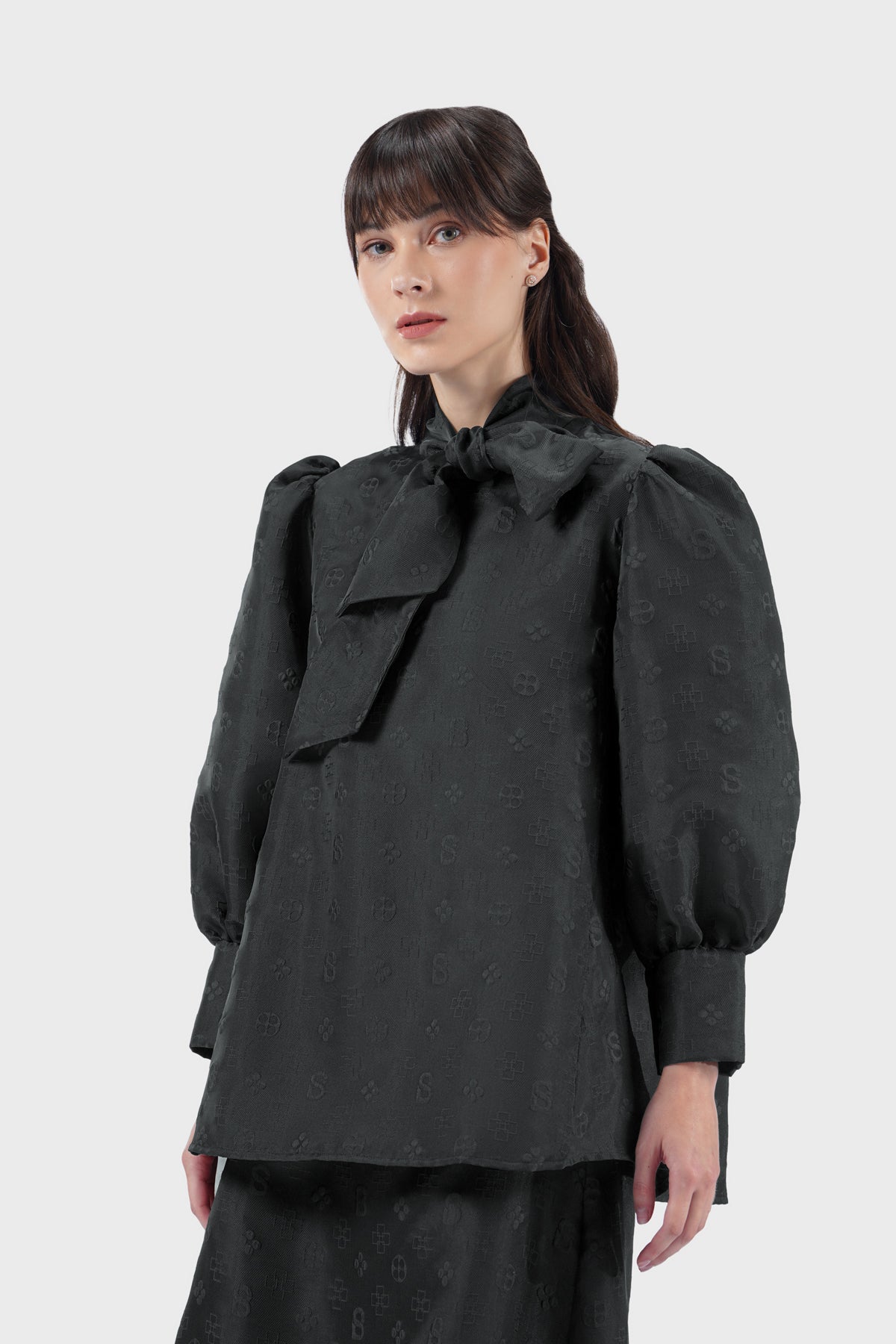 A polished, elegant piece crafted from lightweight, semi-sheer fabric adorned with a signature monogram pattern. Designed with a graceful self-tie bow at the neckline, voluminous puff sleeves, and delicate button accents at the back, it offers a refined silhouette perfect for formal or special occasions.
