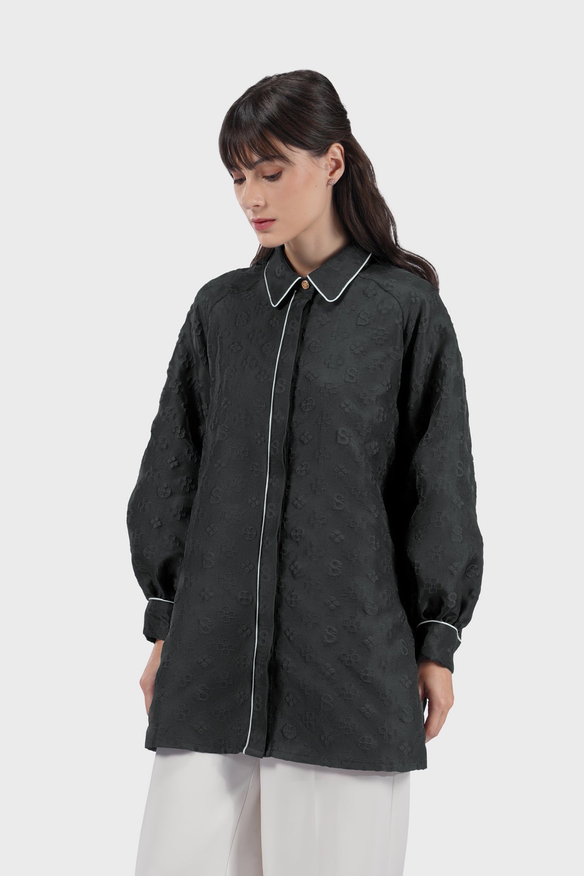 A chic piece crafted from lightweight, subtly textured fabric adorned with signature monogram pattern. Featuring a classic shirt collar, front button fastening, and contrast piping for a polished finish. It offers a sophisticated, exclusive appeal with every wear.
