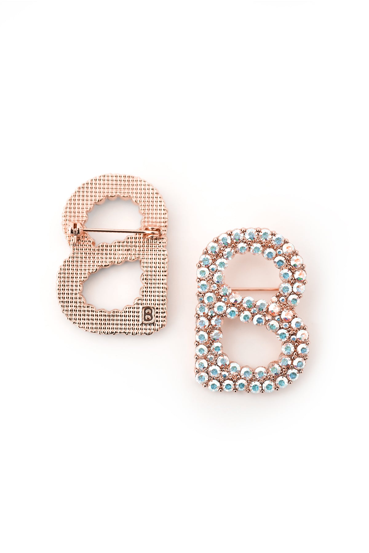 Elevate your daily look with this luxurious B-shaped brooch. This lovely piece of accessory is beautifully embellished with Swarovski crystal clear stones made of delicate brass and gold plated.
