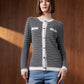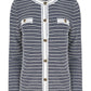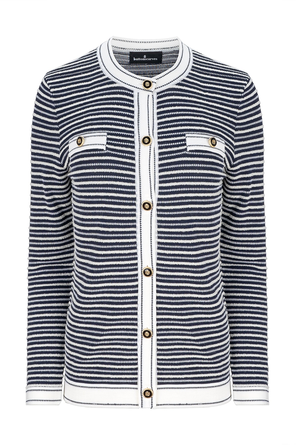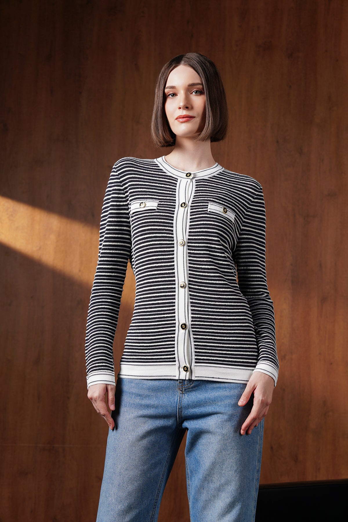 A chic and versatile piece that effortlessly elevates any ensemble. Crafted with a timeless horizontal stripe pattern and logo-engraved buttons that add a subtle touch of recognition, the ribbed knit ensures a comfortable and flattering fit.