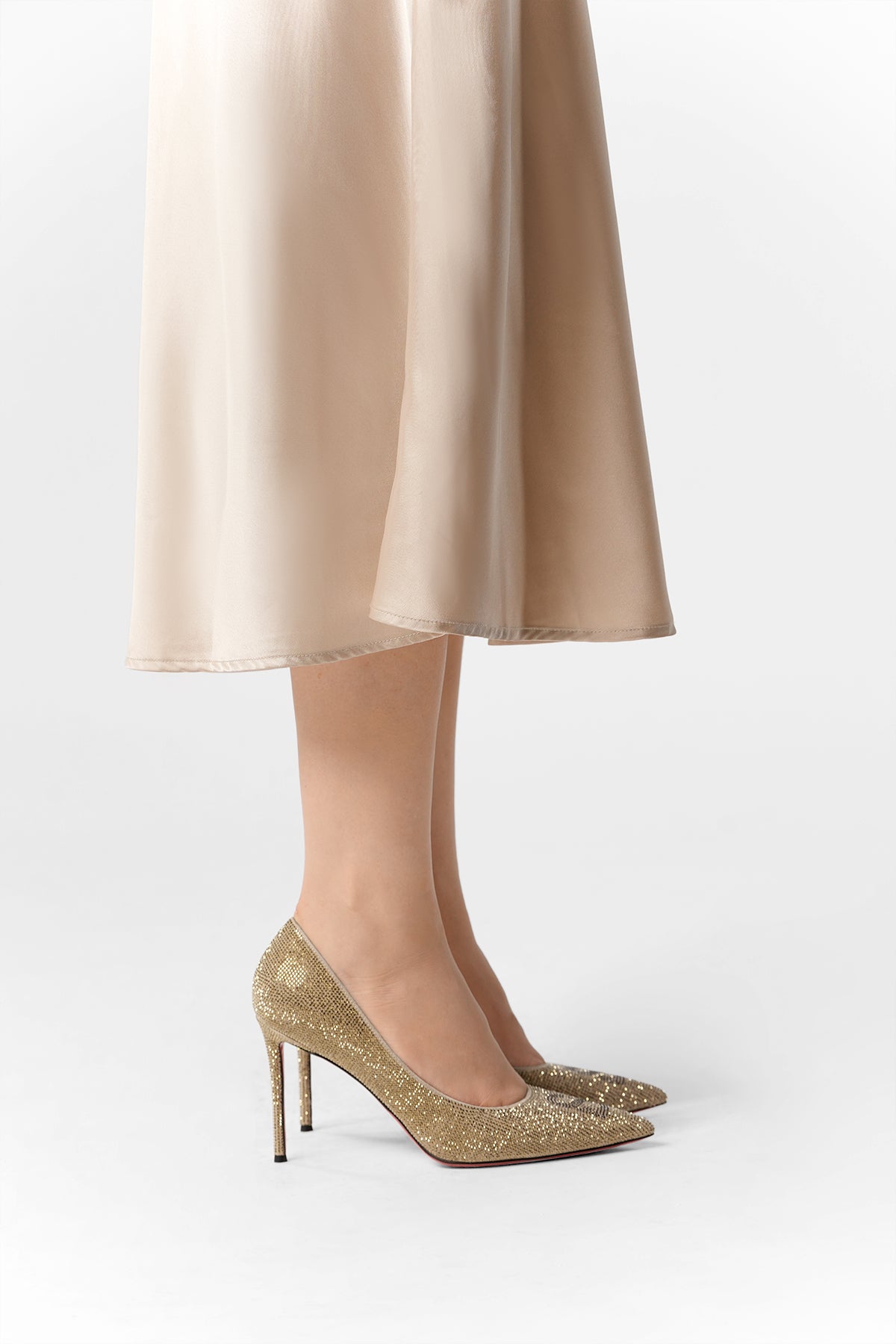 Crafted from sheep suede with radiant rhinestones embellishment, these heels catch the light with every step. The signature B logo graces the cap, while the pointed toe and sleek stiletto heel bring elegance to any look.