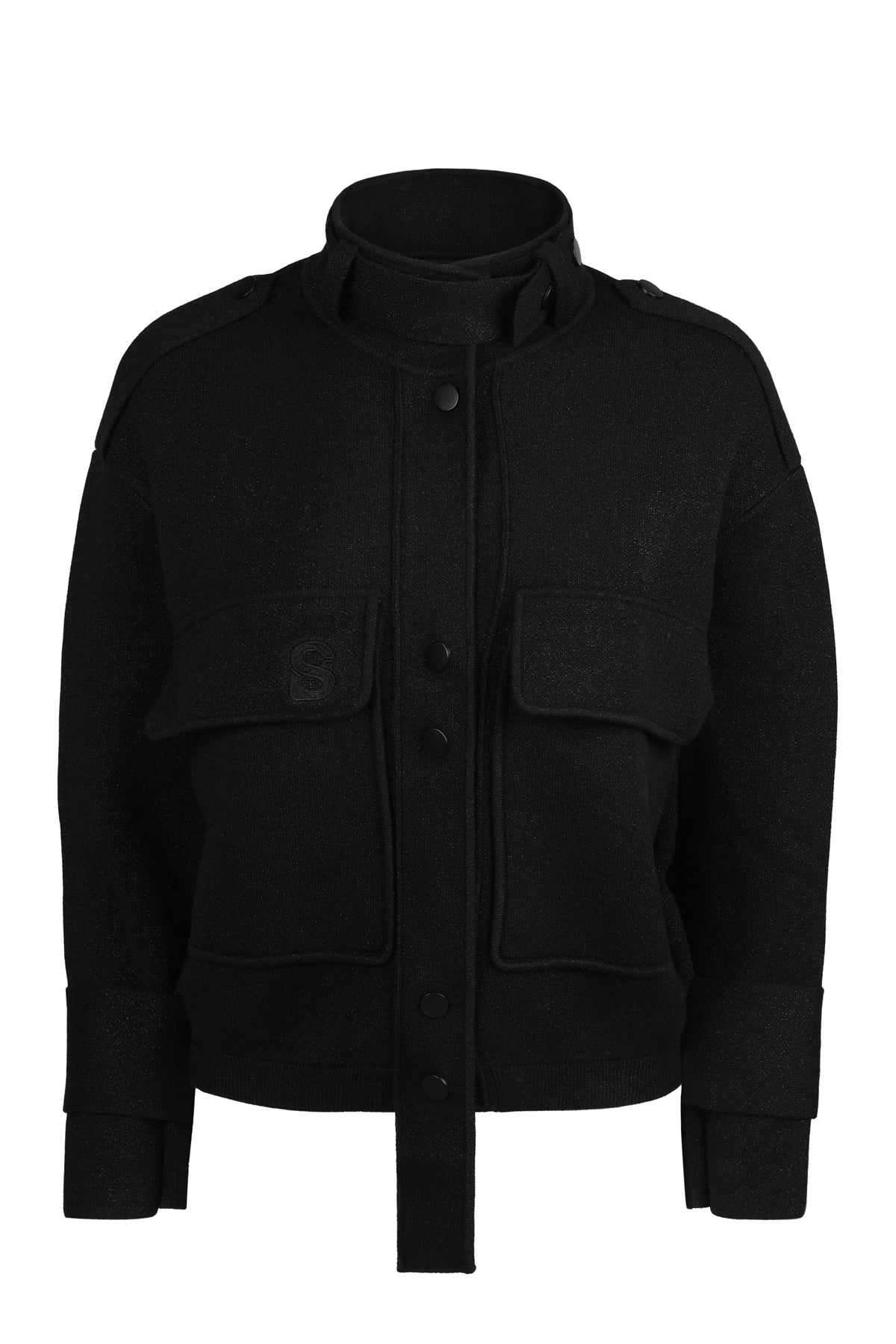 This knitted jacket features a chic shawl collar with stud fastenings, complemented by two exaggerated chest patch pockets for an edgy touch.