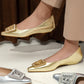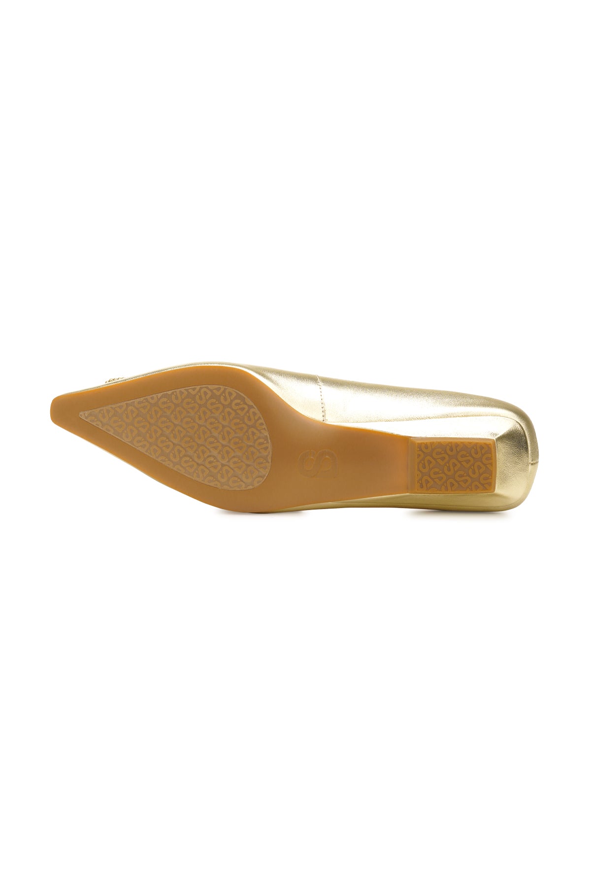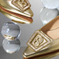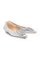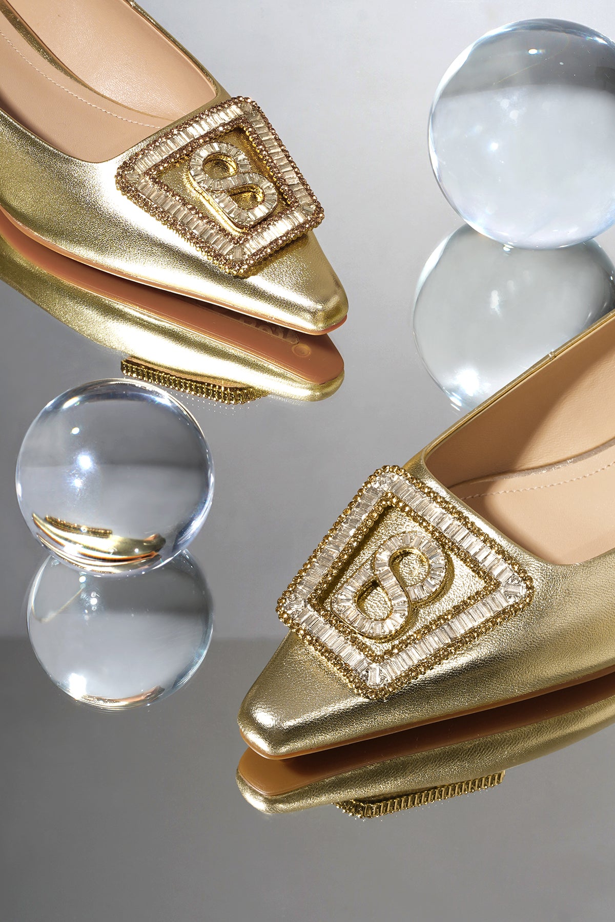 Crafted from metallic sheepskin leather for a luxurious touch and featuring a square jewel buckle with the signature B logo in the middle, these shoes have a pointed-toe silhouette that exudes elegance.