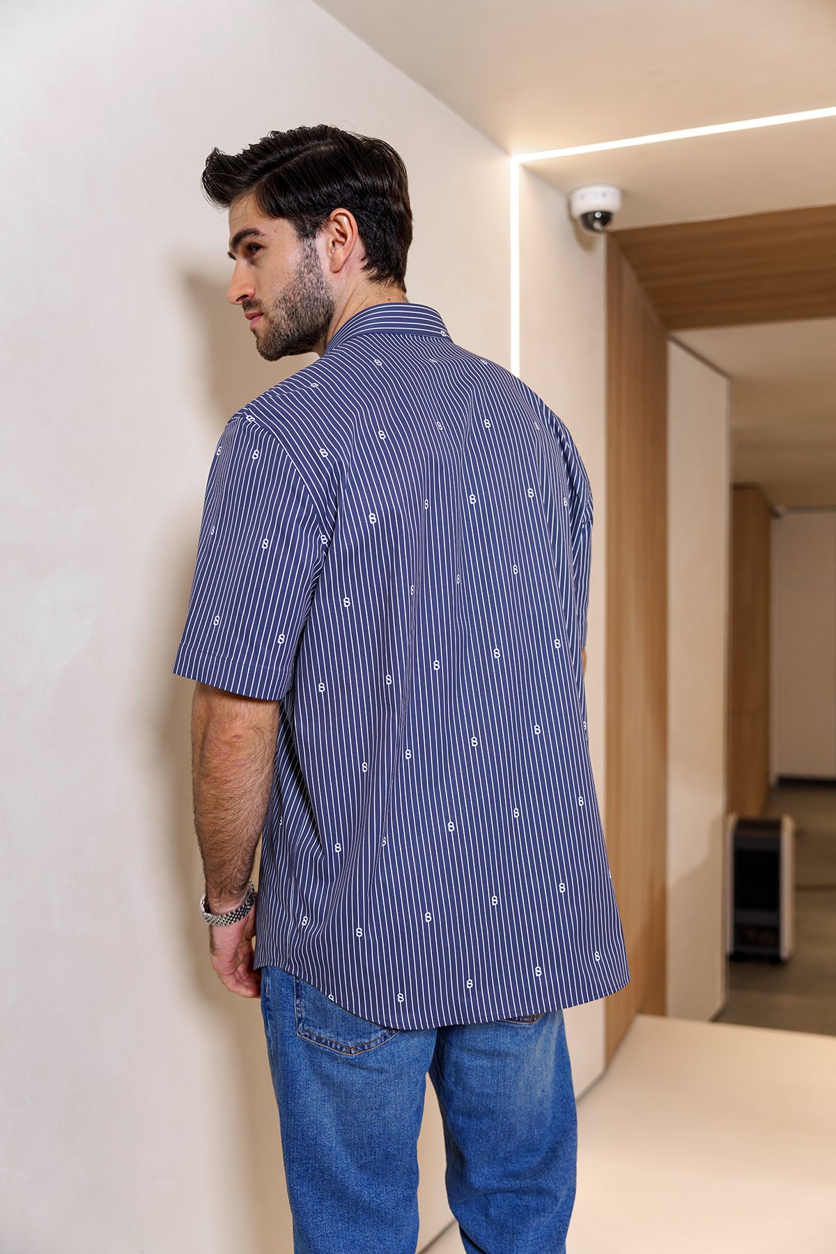 This shirt features a timeless striped pattern complemented by signature B monogram. The left chest boasts a sleek jetted pocket for a refined look, while the spread collar and short sleeves offer both comfort and contemporary style.