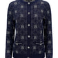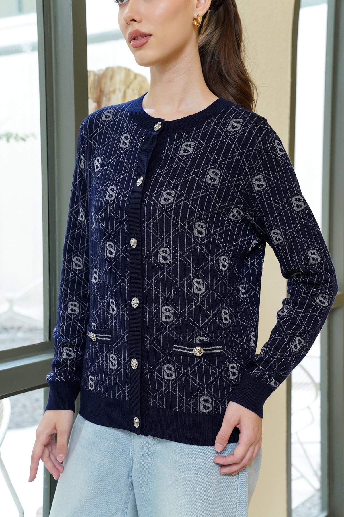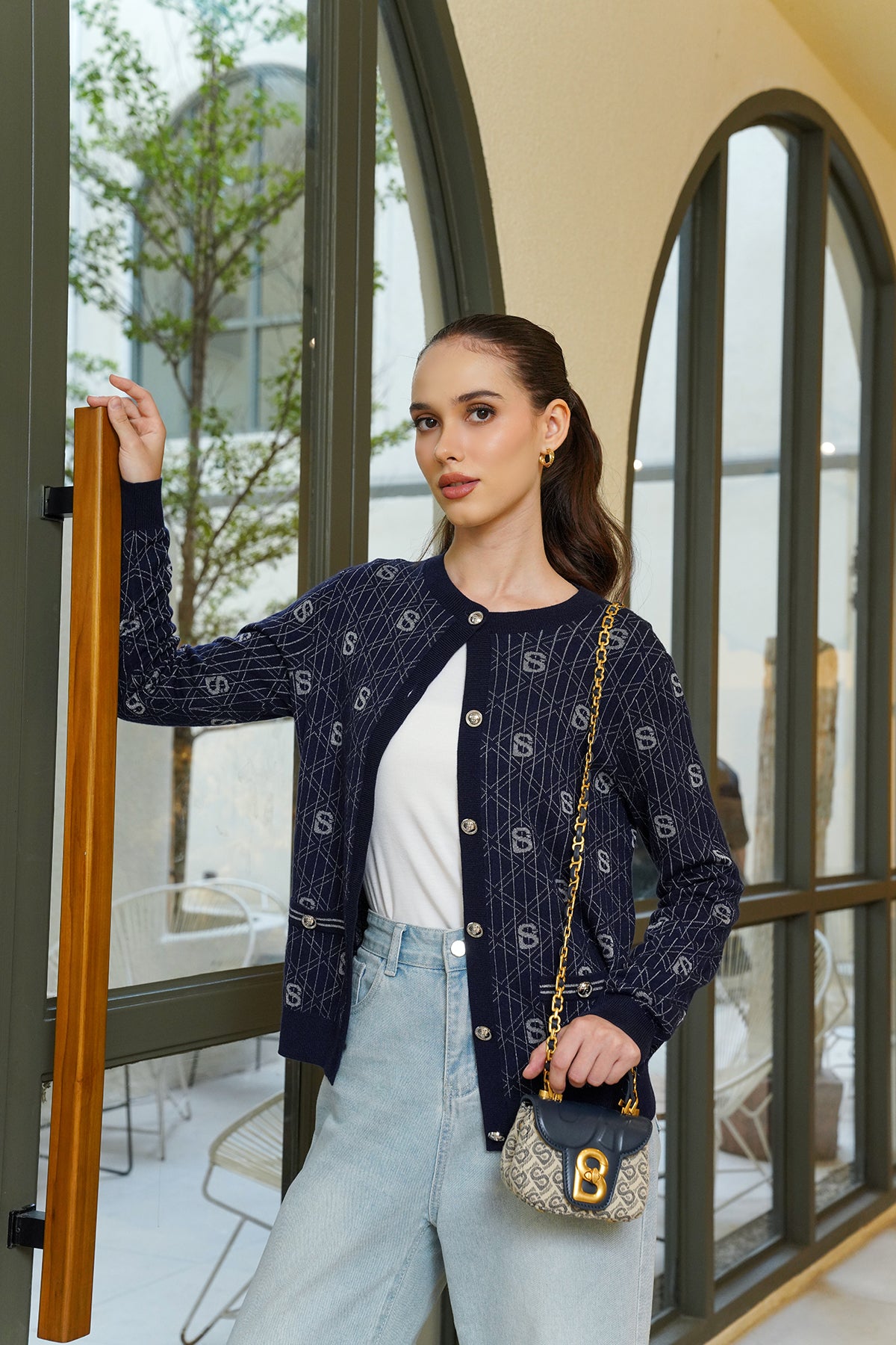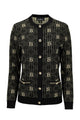Crafted from lightweight material, this cardigan offers both comfort and style. Featuring a geometric and signature B pattern, it adds a touch of elegance to any ensemble. Adorned with signature B gold buttons and accented faux pockets, it exudes sophistication and charm.