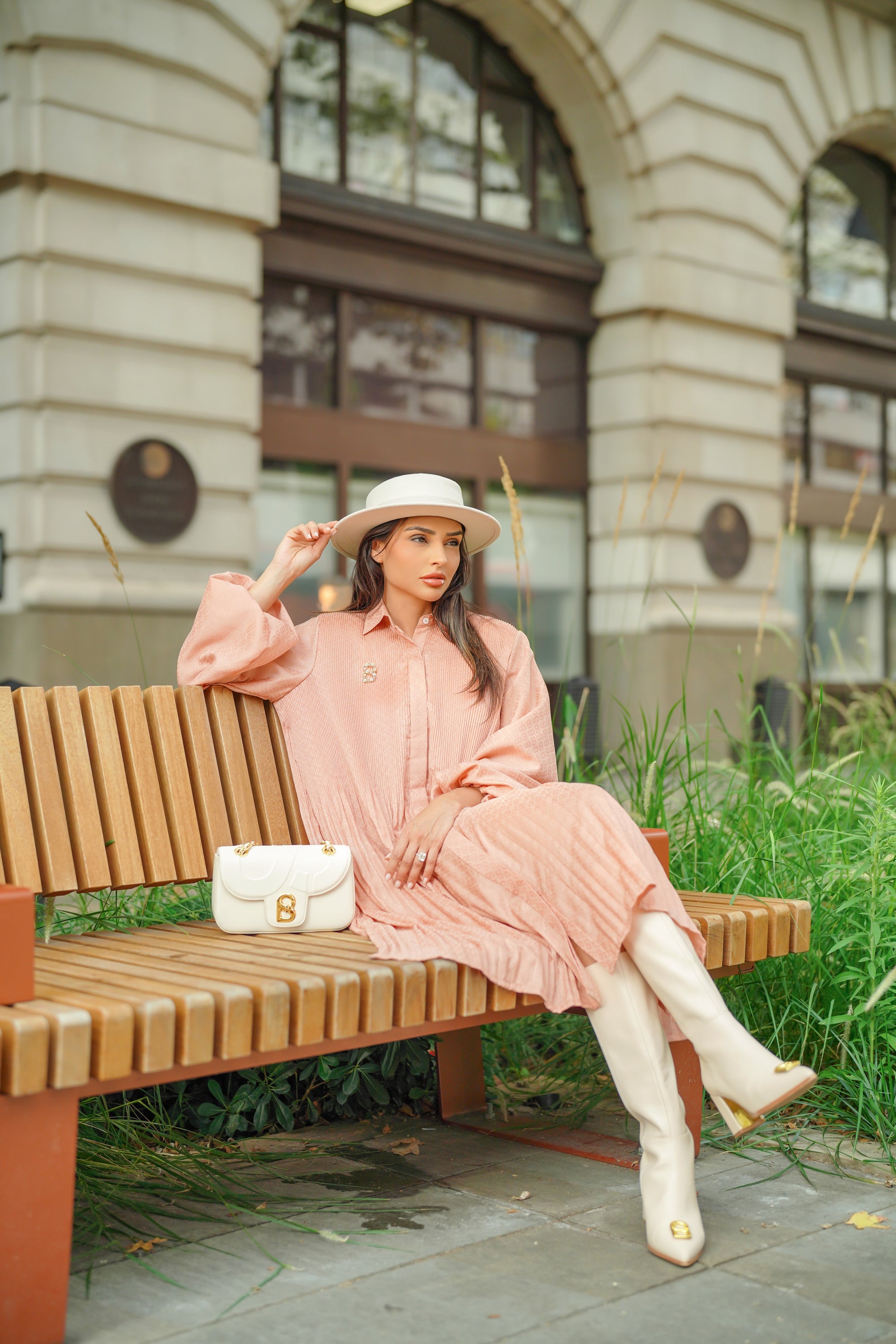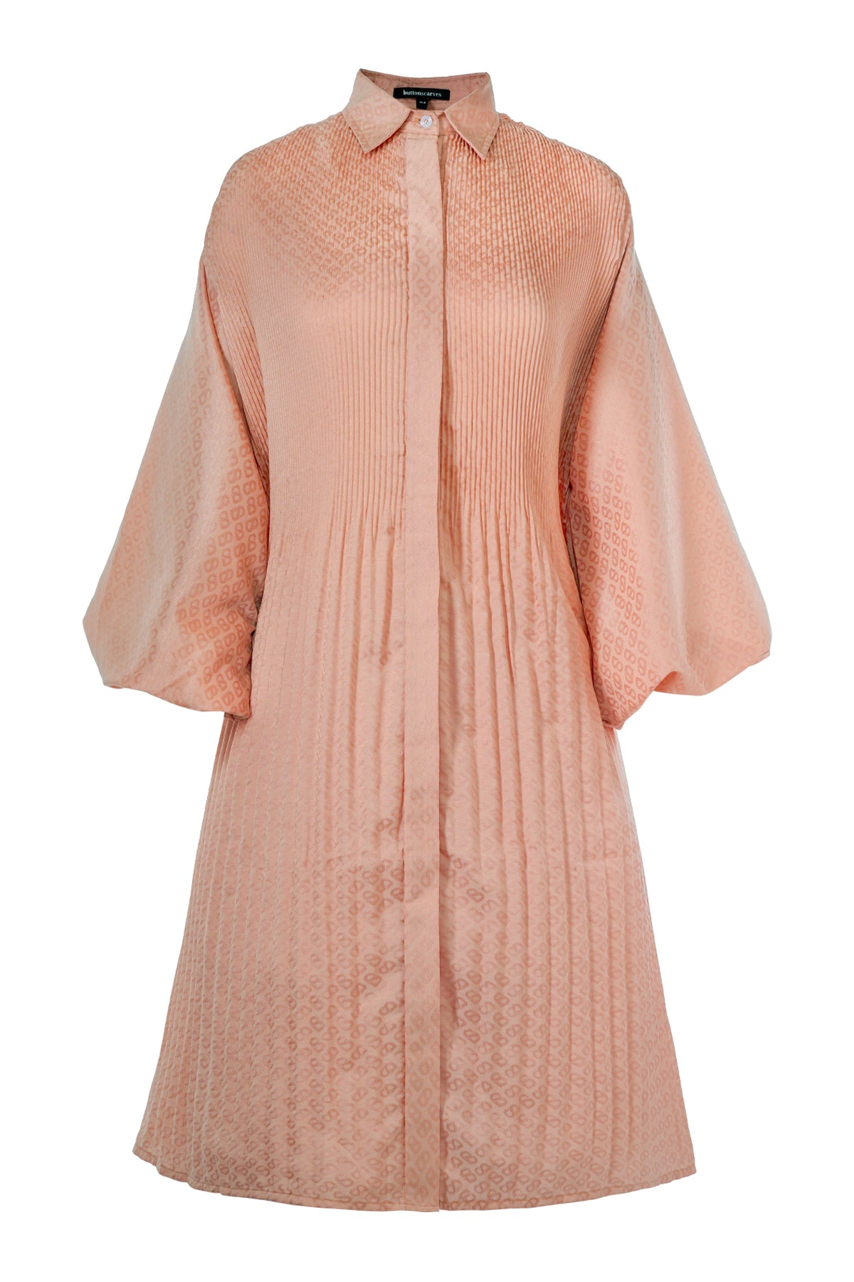As the highlight from the 2023 Jakarta Fashion Week, this shirt showcase. the signature monogram "B" embossed on the fabric serves as a striking emblem of luxury. The shirt features a pleated style, enhancing its visual appeal and creating a sense of movement that is both graceful and captivating.