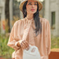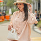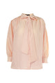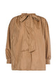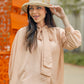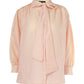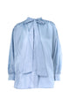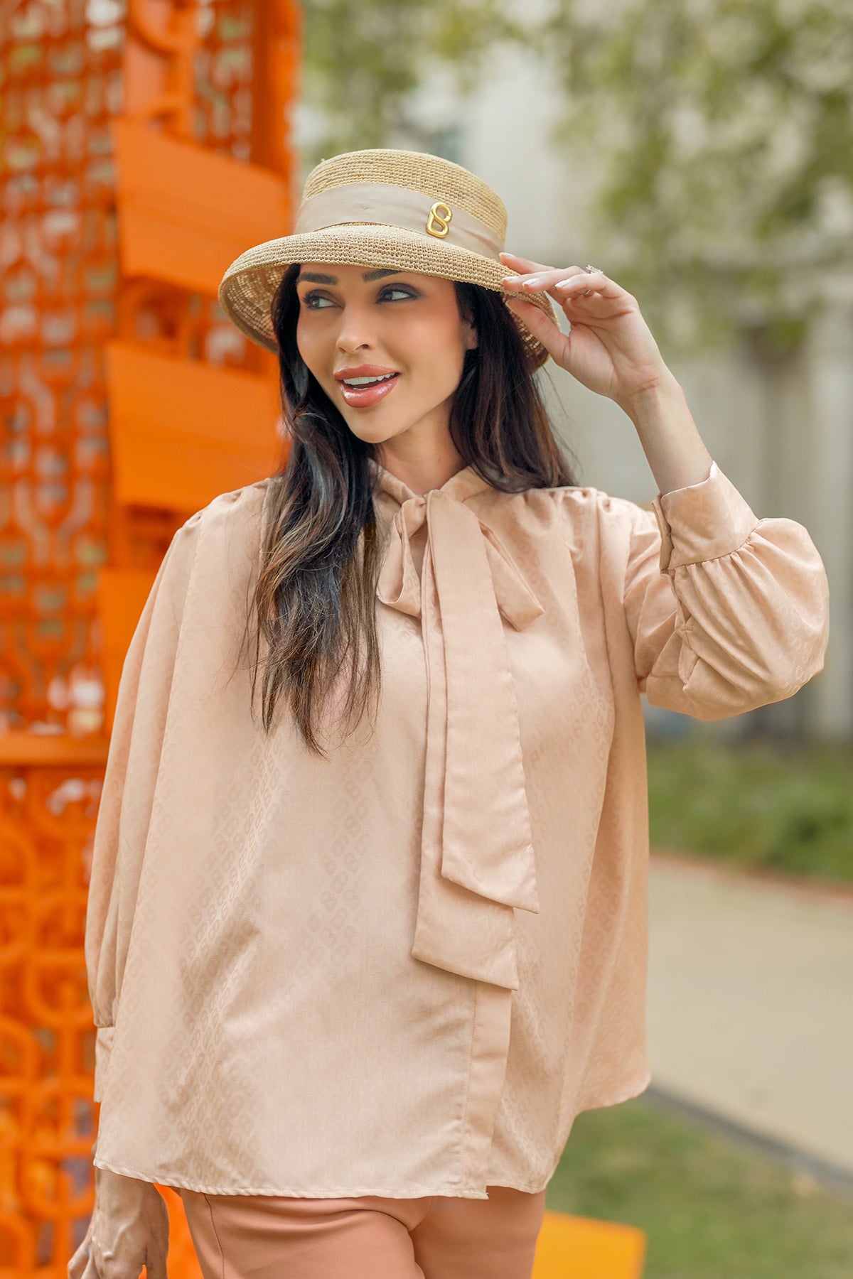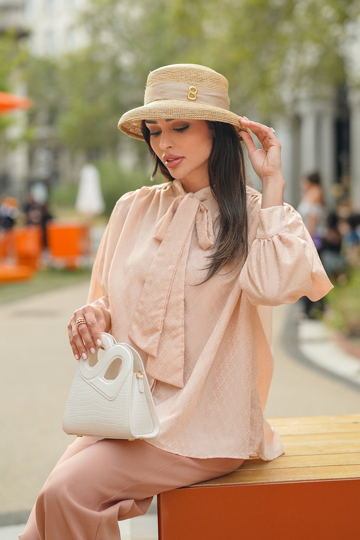 As the highlight from the 2023 Jakarta Fashion Week, this elegant shirt is adorned with a self-tie bow that imparts a distinctly feminine charm. The shirt's fabric is embossed with the signature monogram "B," further emphasizing the brand's commitment to sophistication.