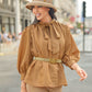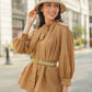 As the highlight from the 2023 Jakarta Fashion Week, this elegant shirt is adorned with a self-tie bow that imparts a distinctly feminine charm. The shirt's fabric is embossed with the signature monogram "B," further emphasizing the brand's commitment to sophistication.