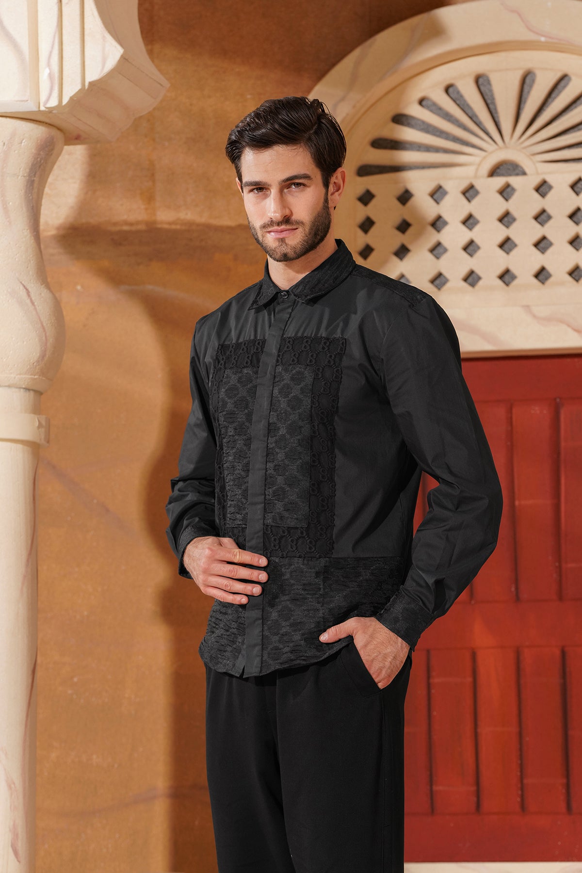 Exclusive Raya Collection, this shirt is adorned with the signature monogram embroidery. With its long sleeves and collar design, it offers a classic yet sophisticated look. The hidden front button fastening adds a sleek finish, making it perfect for any Raya celebration.