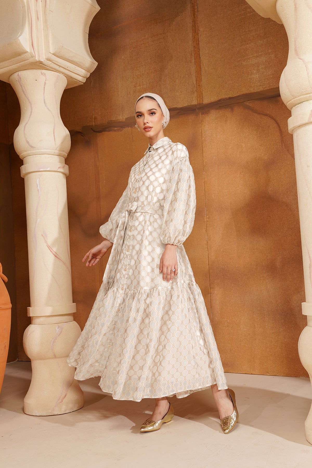 Exclusive Raya collection, this elegant dress features our signature monogram pattern. With its long puff sleeves and front button fastening, it offers both style and convenience. Complete with a self-tie belt and ruffle hem, this dress is perfect for making a statement during the festive season.