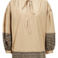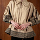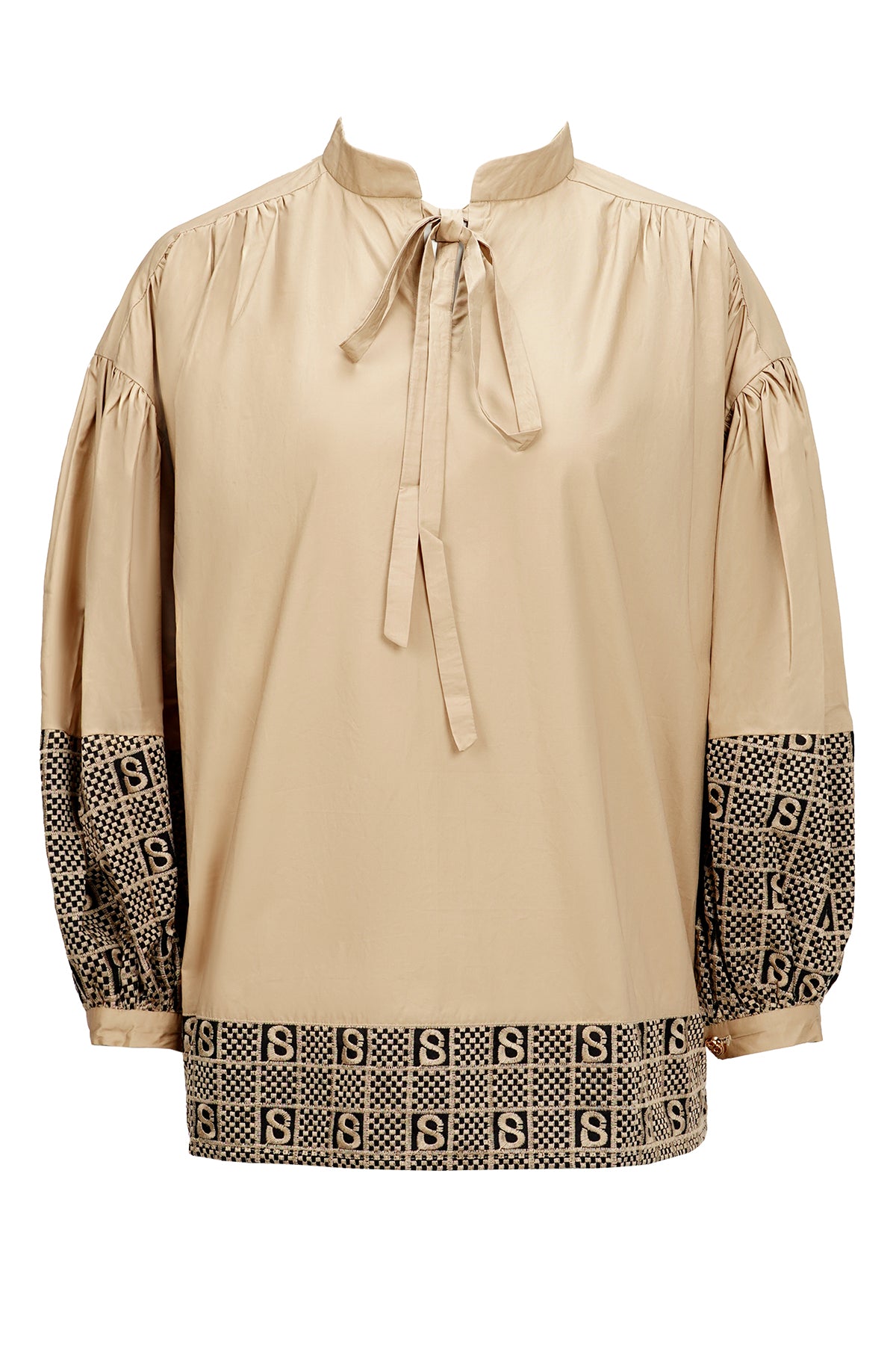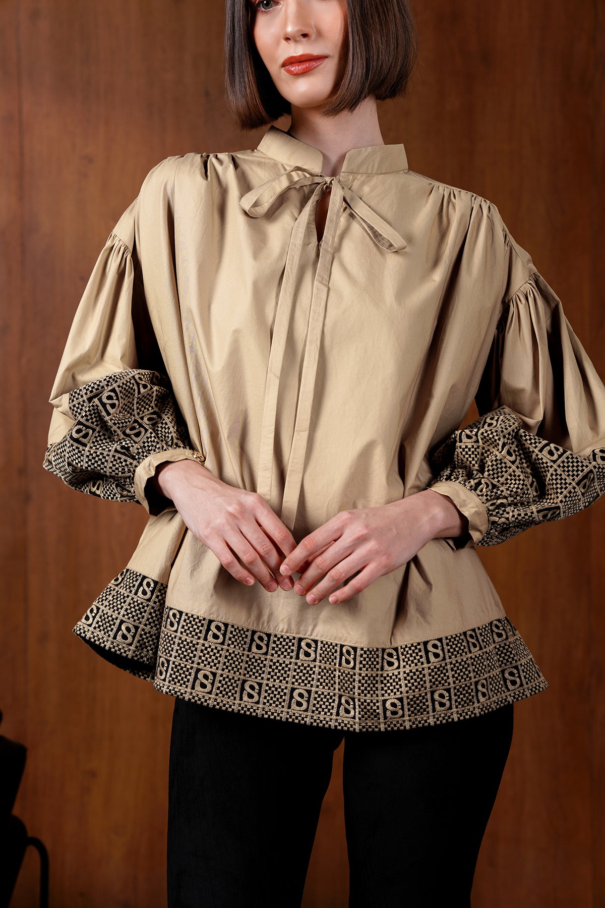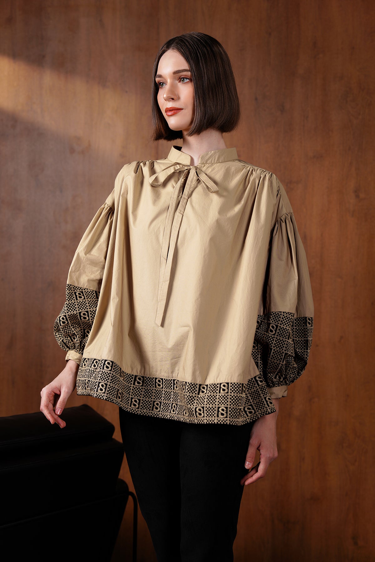 Adorned with our signature monogram plaid pattern, this blouse adds a touch of sophistication to any ensemble. The mandarin collar with a self-tie bow detail adds a hint of elegance, while the gathered puff sleeves offer a stylish silhouette.