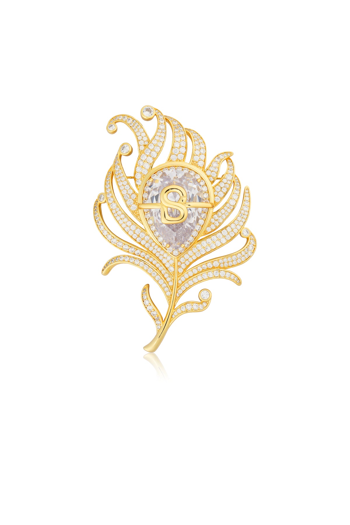 An opulent piece featuring a radiant feather design, adorned with shimmering crystals and intricate gold detailing. At its center, is a striking teardrop-shaped gemstone, embellished with the signature "B" Logo.