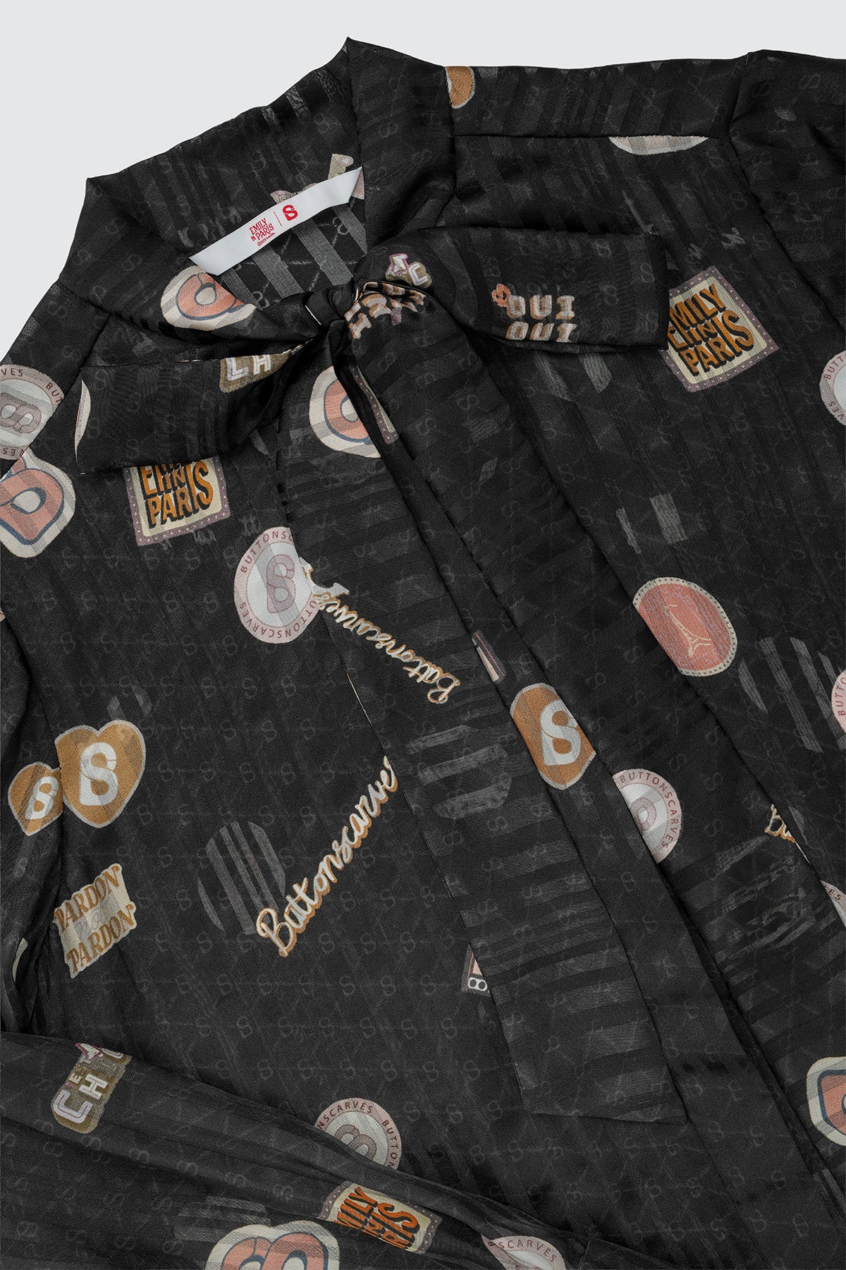 Inspired by the hit TV series Emily in Paris, this printed silk blouse brings Parisian charm. Crafted from pure silk with a fluid drape, the playful Paris-inspired motifs are completed by a classic bow-tie neckline, creating a look that feels confident, feminine, and subtly bold.