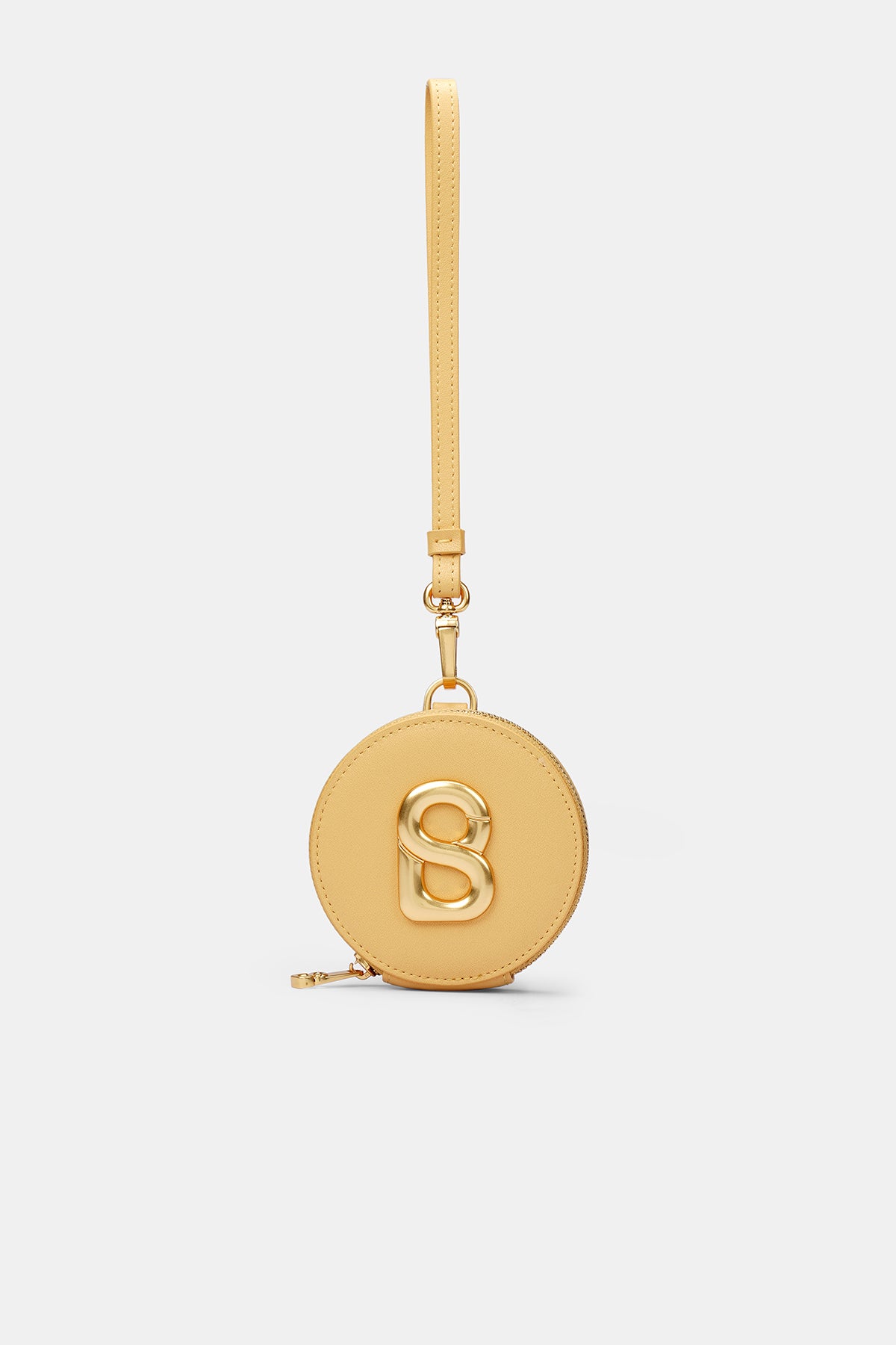 A stylish and multifunctional accessory designed for both practicality and charm. Its rounded silhouette makes it perfect for use as a bag charm or a compact purse for storing small essentials. It's accentuated by the bold B metal logo at the front.